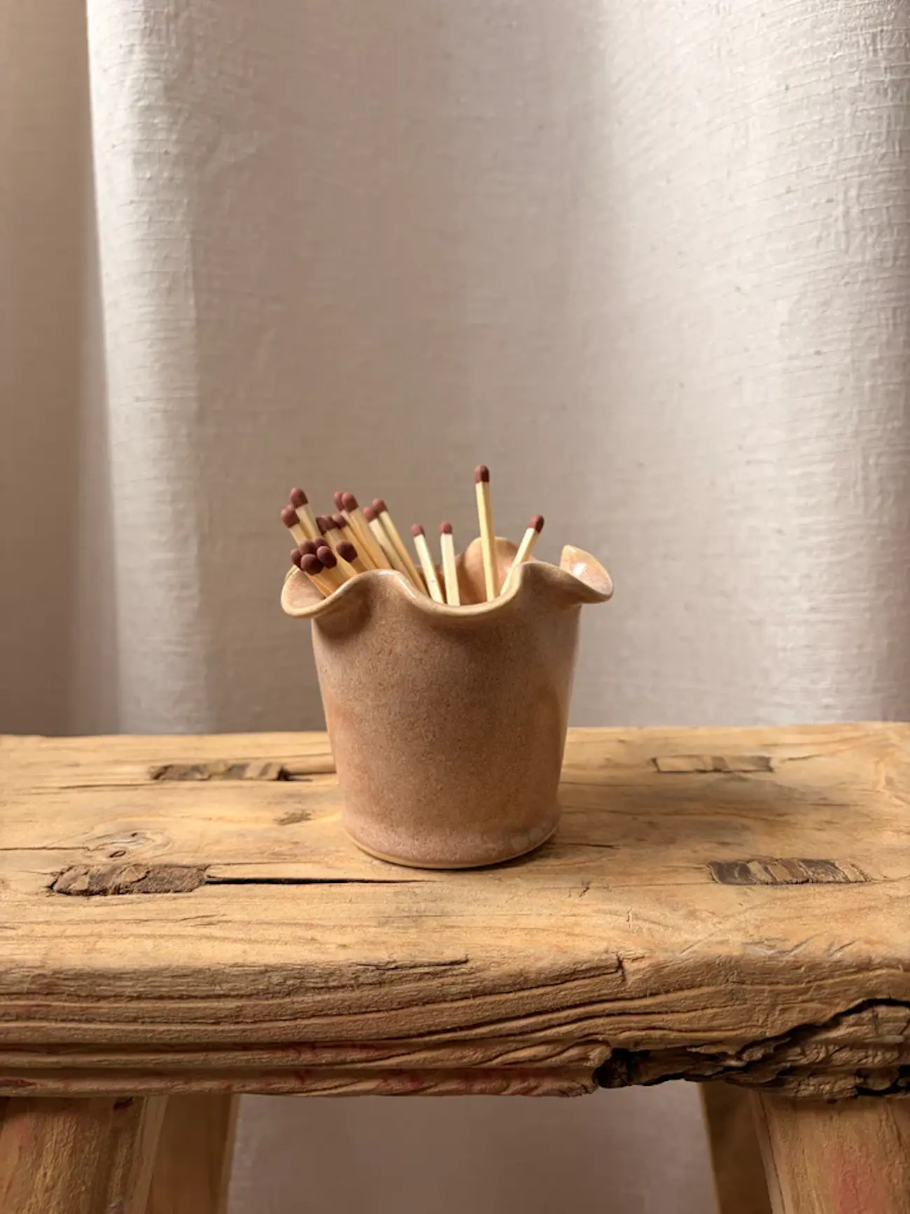 Frilly wheel thrown matchstick pot, with strike sticker to stick to the base.