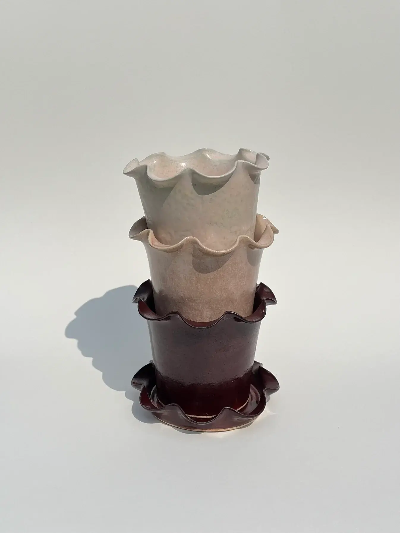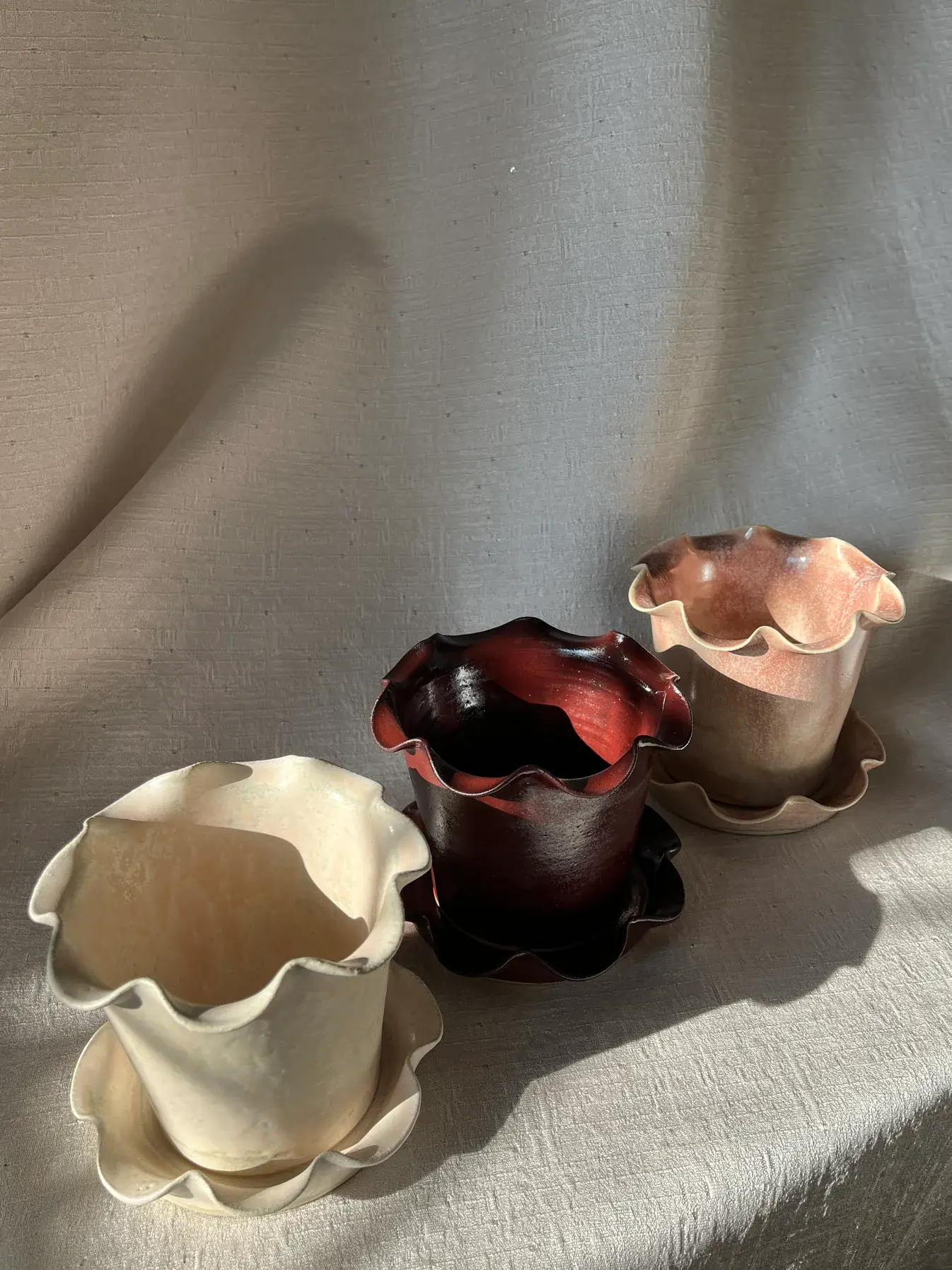 A delicate handmade ruffle plant pot and matching saucer, thrown on the wheel in my little studio, and hand-shaped to form its frilly edge. After the first bisque firing the pots are coated in a dark cherry coloured glaze, and fired again to 1220°C to achieve a unique surface and finish.