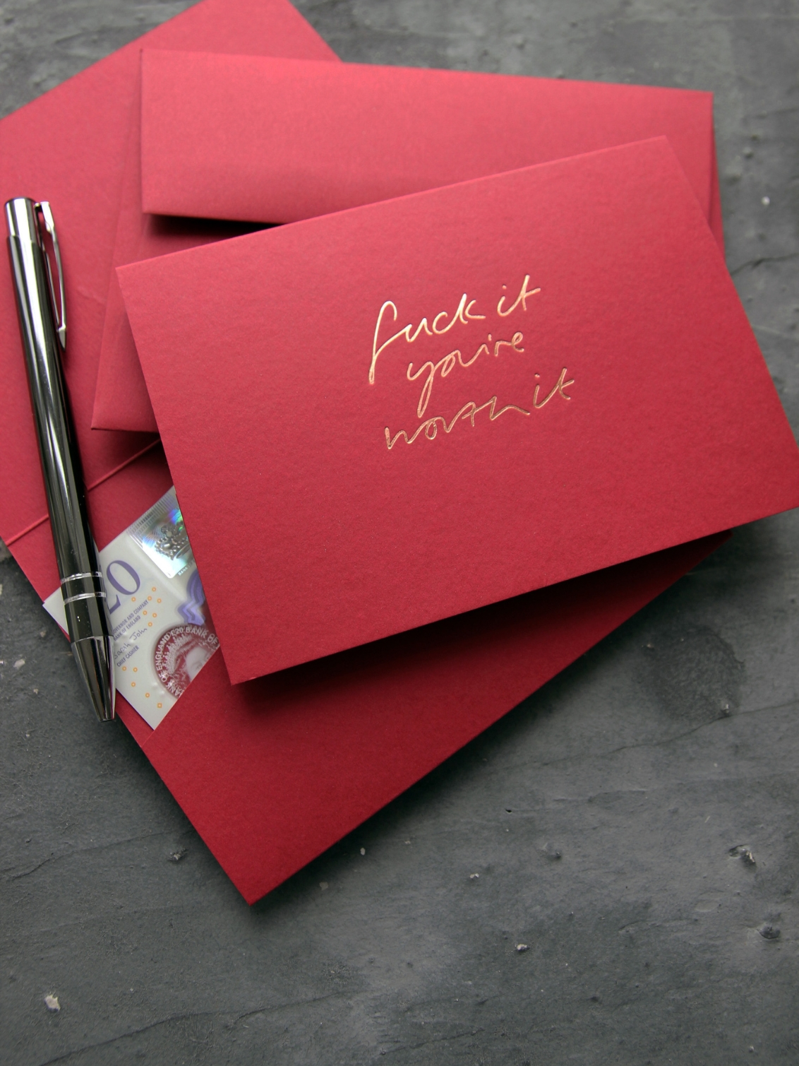 Let’s not overcomplicate it. Cash works. This hand-foiled card in rose gold on scarlet paper keeps things clean, festive, and to the point. Ideal for when wrapping feels like a chore but you still want it to look good.