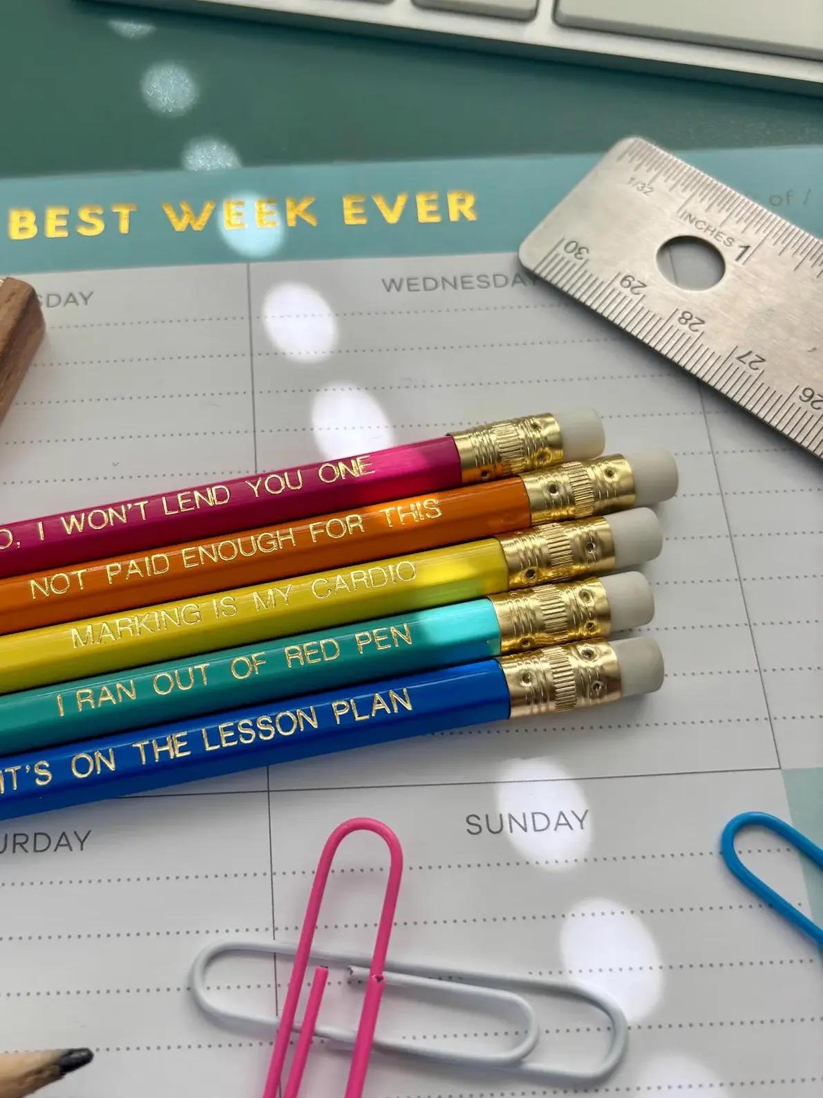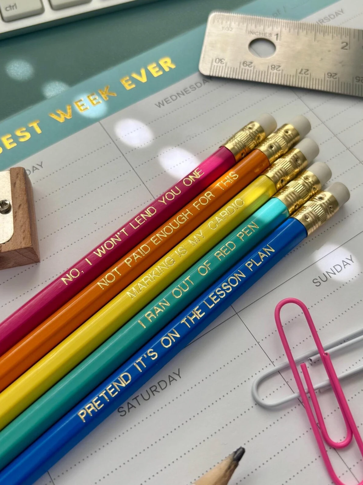 Give the gift of laughter with this set of funny, relatable teacher pencils — perfect for end-of-term gifts, teacher appreciation week, or just because your favourite teacher deserves a smile (and probably a strong coffee)...