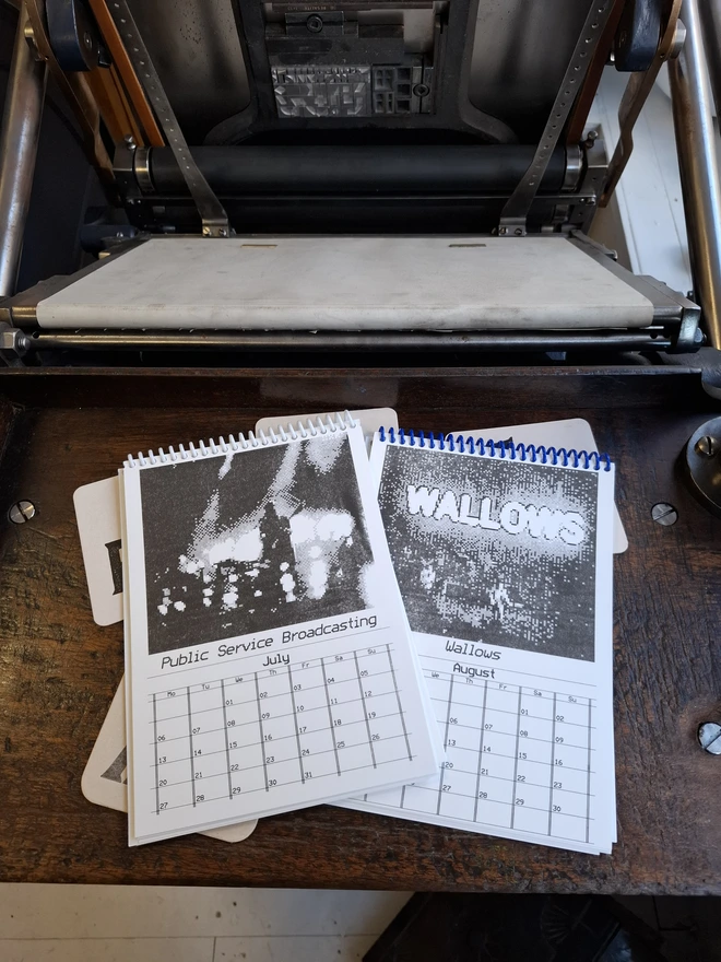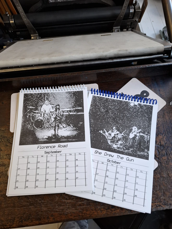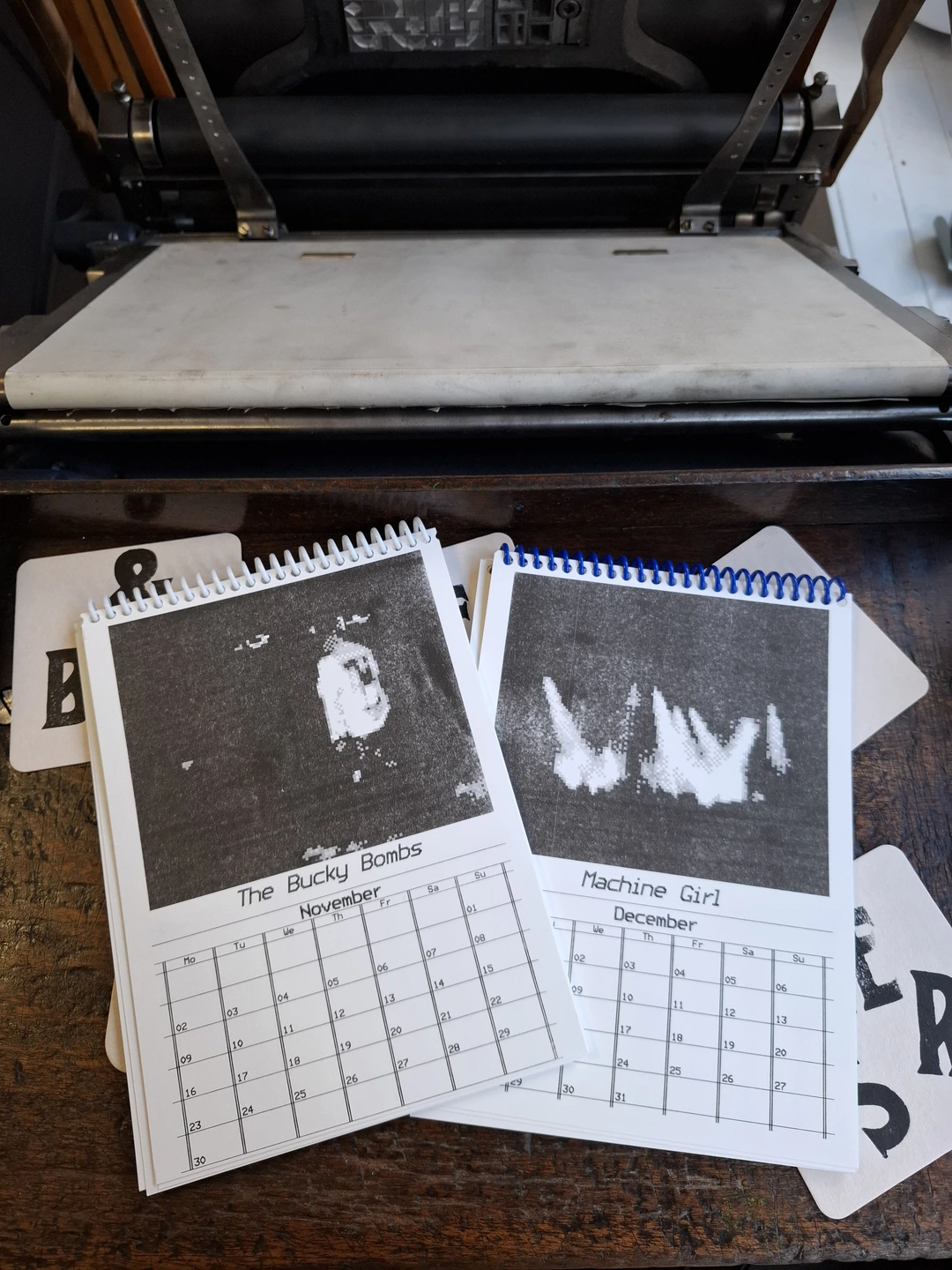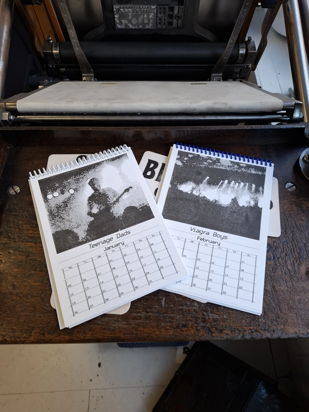 A5 calendar with hanging clip. Cover pages are laser printed. Months risograph printed on 250gsm paper with vegetable-based ink.