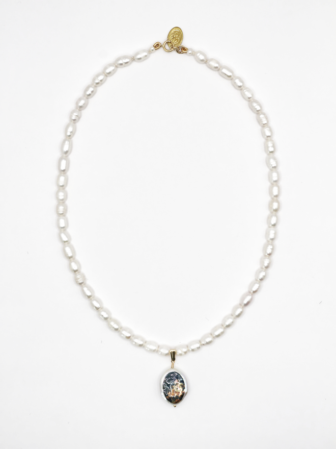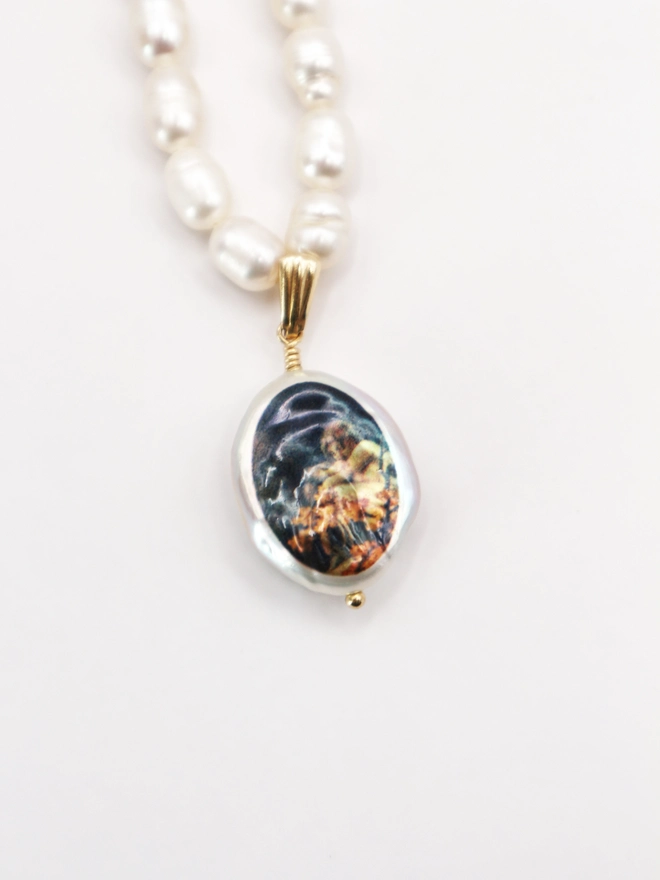 A fresh water pearl necklace with an oval pearl pendant hand printed with the image of a cherub in a garden, extracted from an antique painting.
