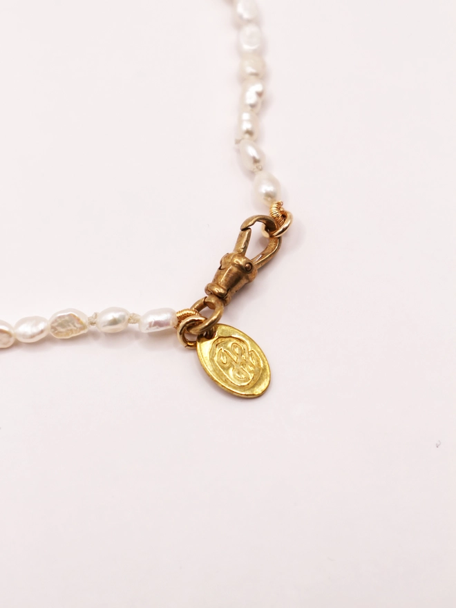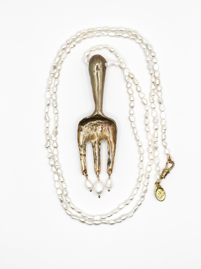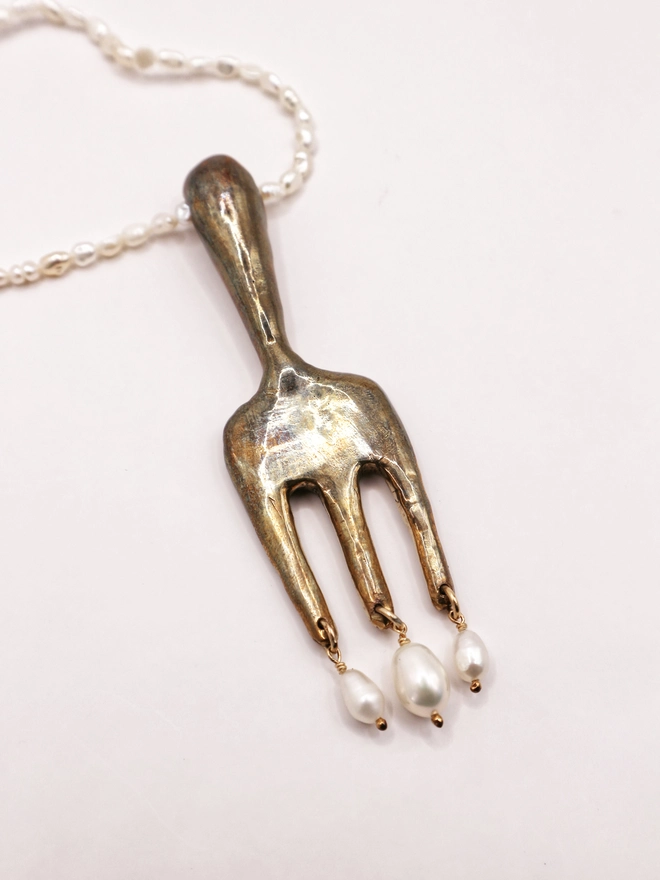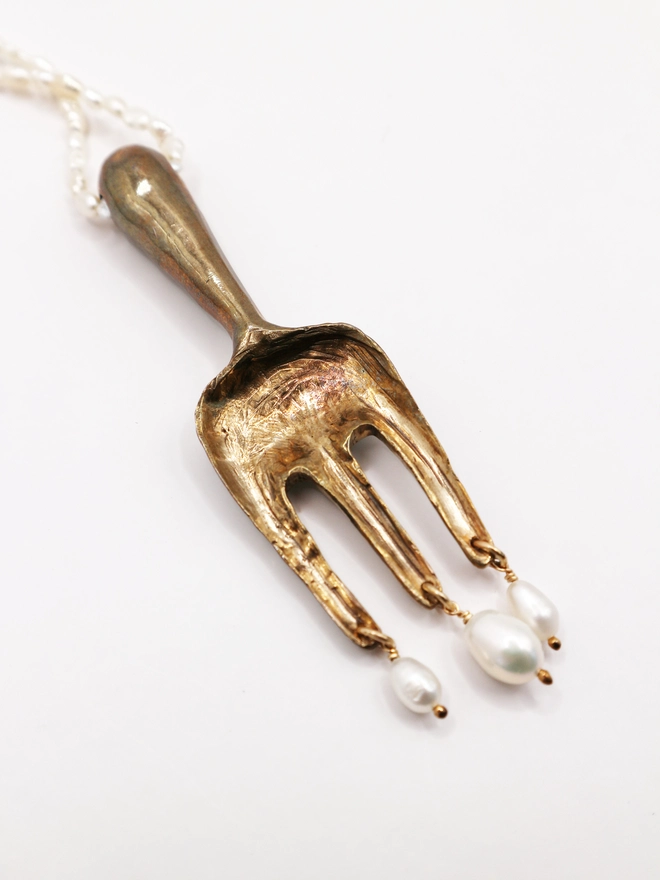 The garden fork charm is hand-carved from jeweller's wax, then cast in bronze using the ancient lost wax technique. The raw casting is then meticulously filed and polished to achieve a rich, golden shine before being adorned with a large teardrop pearl - a gem championed by both Elizabethans and Jacobeans.