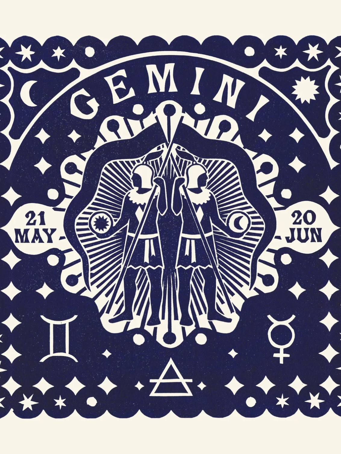 Shown on this print is an approximate date span for Gemini of May 21 – June 20. The dates may vary slightly each year due to Earth's orbit and leap years, so those born near the start or end should check their birth chart to confirm their sign.