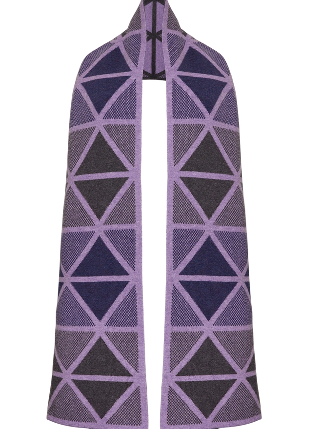 This luxurious blanket scarf adds a statement style to your winter wardrobe with its oversized silhouette and bold pattern. Its blanket-like shape allows it to be an adaptable accessory that can be styled in many different ways to keep you cosy and warm. Knitted in the softest merino lambswool, its jacquard pattern has a tonal reverse, allowing you to wear it either way around to change up the hues. The scarf features a geometric diamond pattern in Lilac, grey and ink blue.
