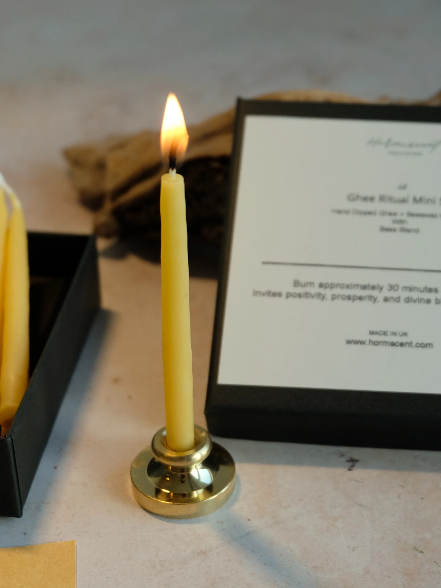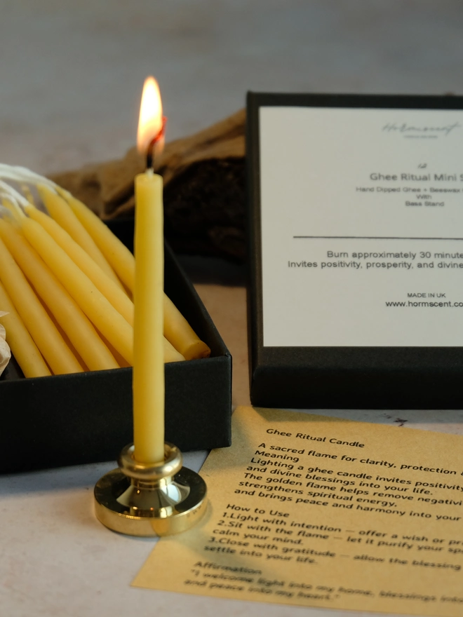 This set includes your choice of 12 mini ghee candles, hand-dipped slowly using pure ghee, beeswax and a cotton wick, plus a small holder for easy use.