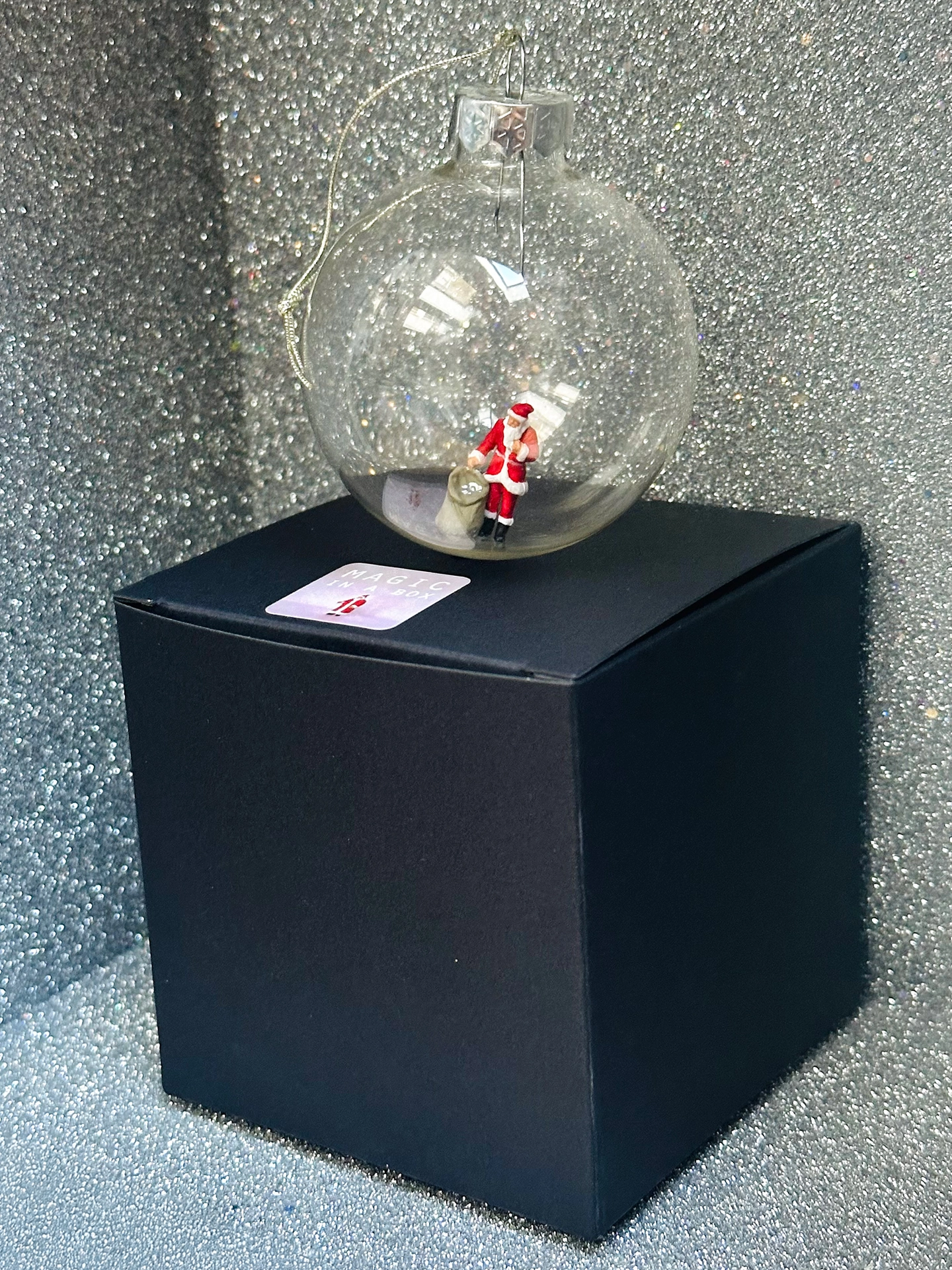 This glass Christmas ornament is 6cm diameter and comes ready to hang, in a lovely black kraft giftbox.