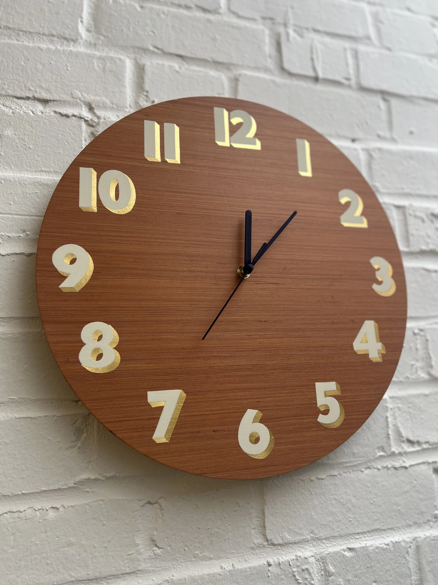 Hand painted using traditional signwriting and gilding techniques, this clock features traditional block numbers. Directionally burnished gold block gives a 3D effect to the hand drawn numbers. Crafted on birch ply, hand painted with champagne flat oil paint and directionally burnished 23 carat gold leaf. Each number is carefully drawn and painted by hand, creating a characterful yet precise finish. A modern heirloom that celebrates artistry, craftsmanship and tradition.