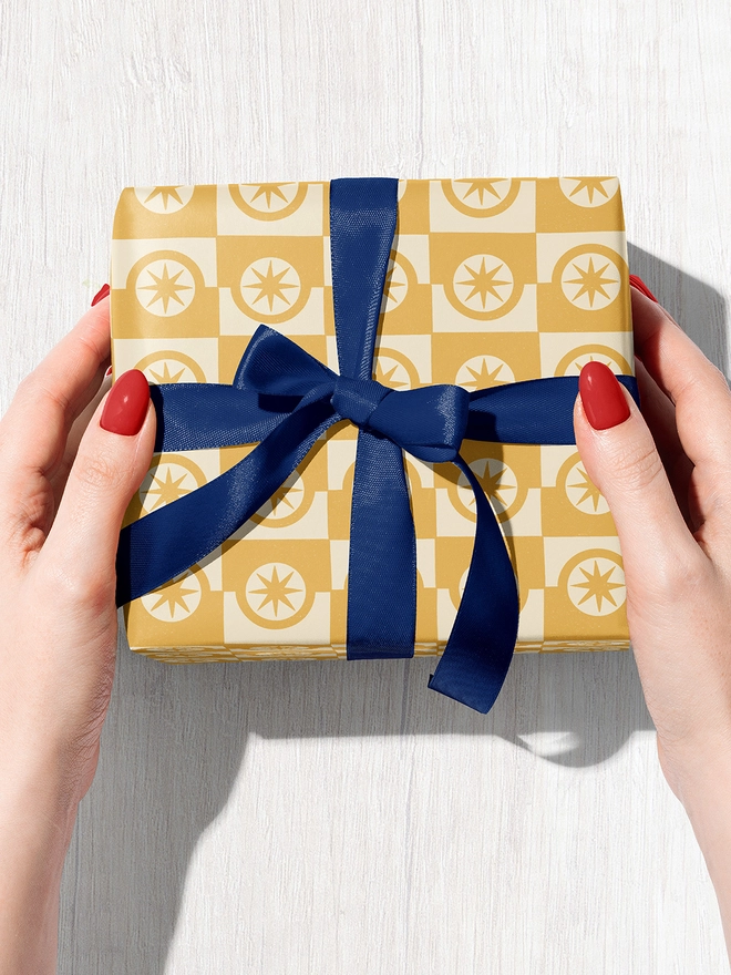 A Modern-retro, geometric compass star design creates the perfect Christmas wrapping paper for outdoor lovers and adventure seekers.