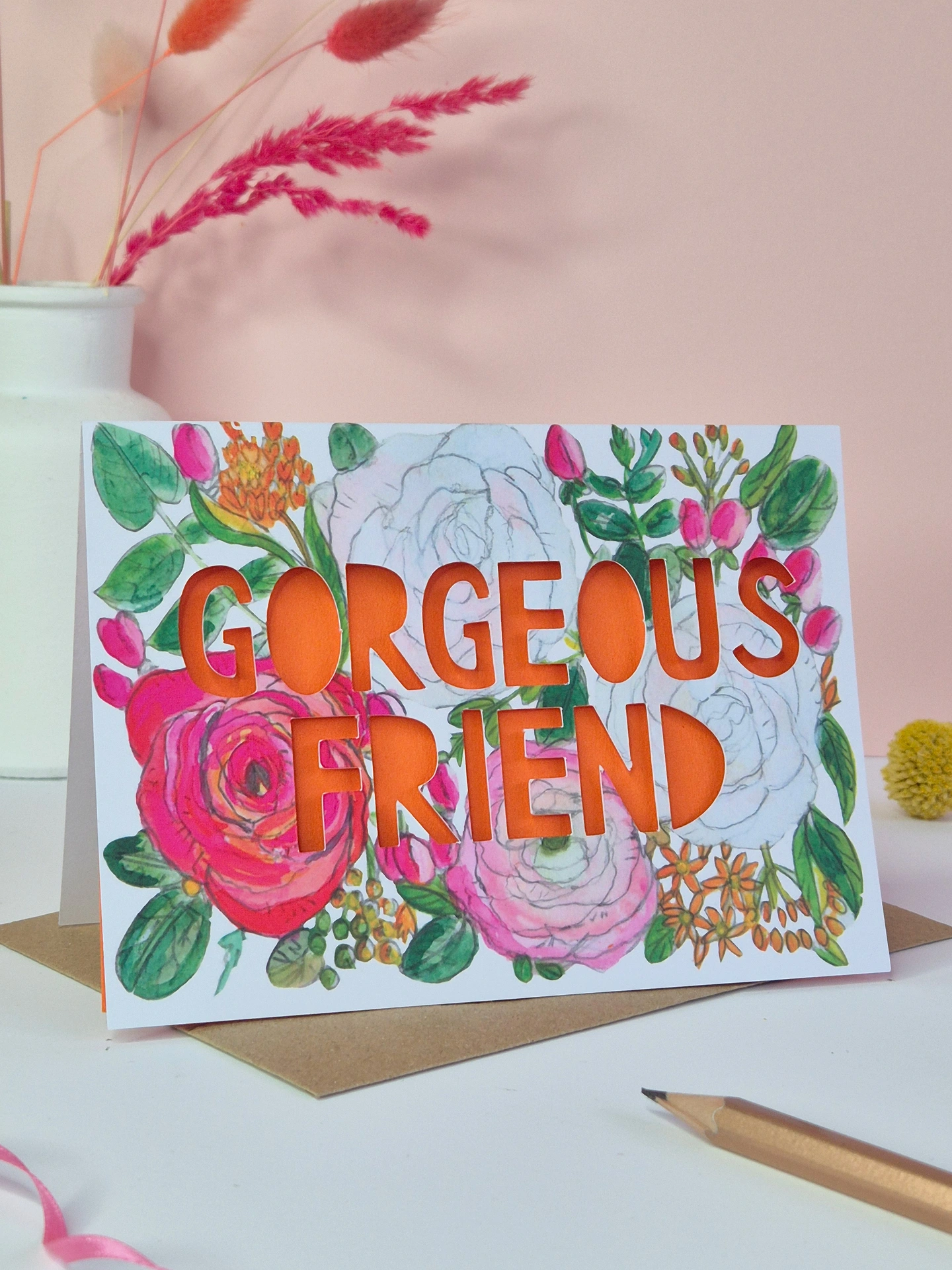A beautiful galentine's or birthday card for a friend with painted orange and pink flowers with paper cut typography that says 'Gorgeous Friend'. Can be kept afterwards as a mini-art piece too!