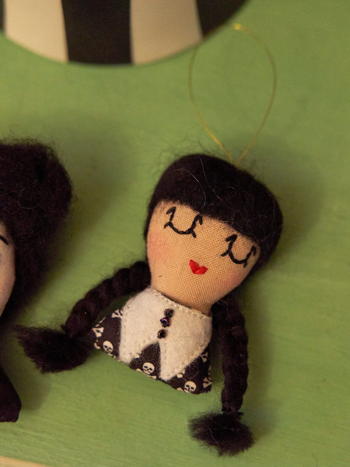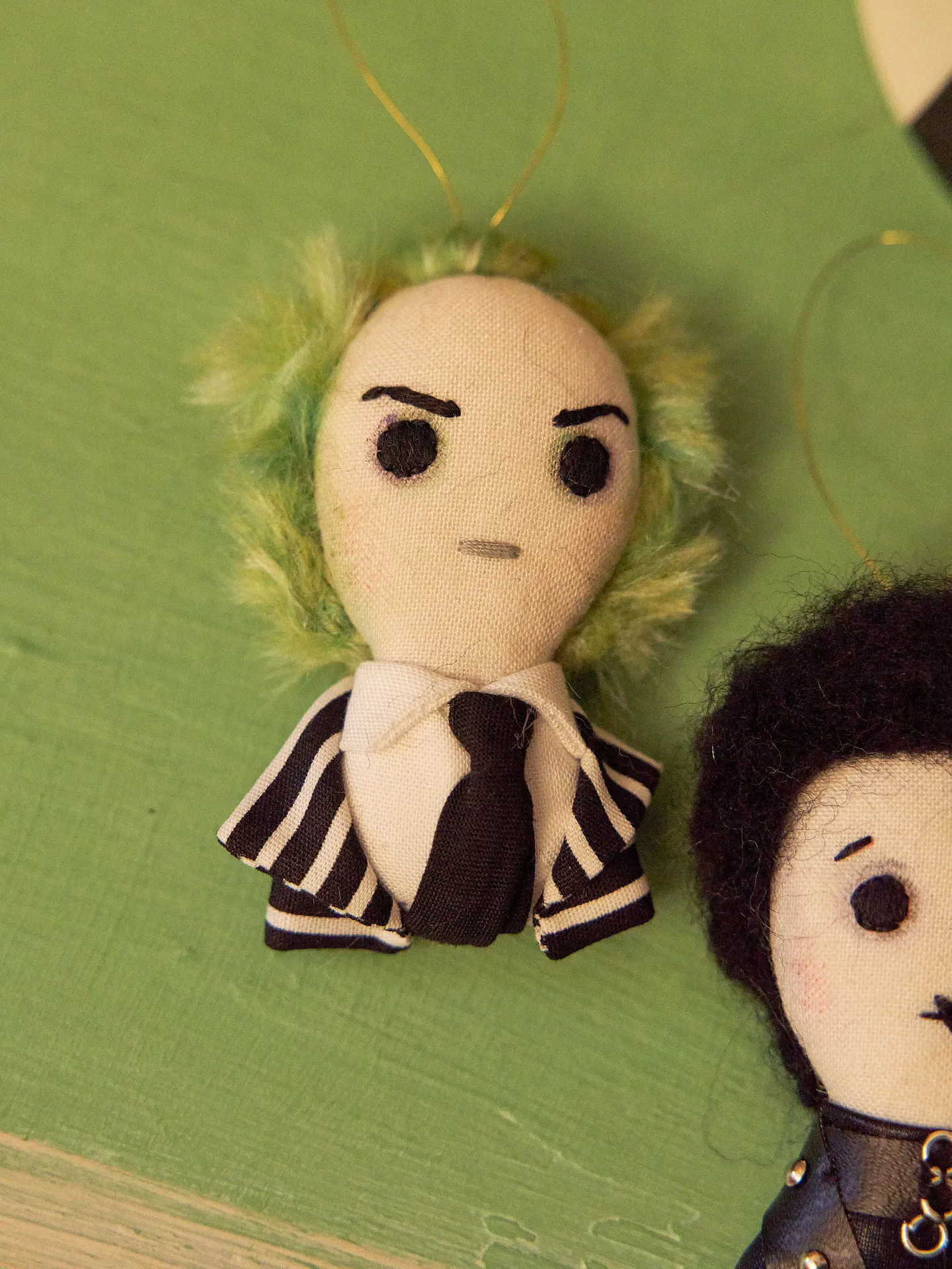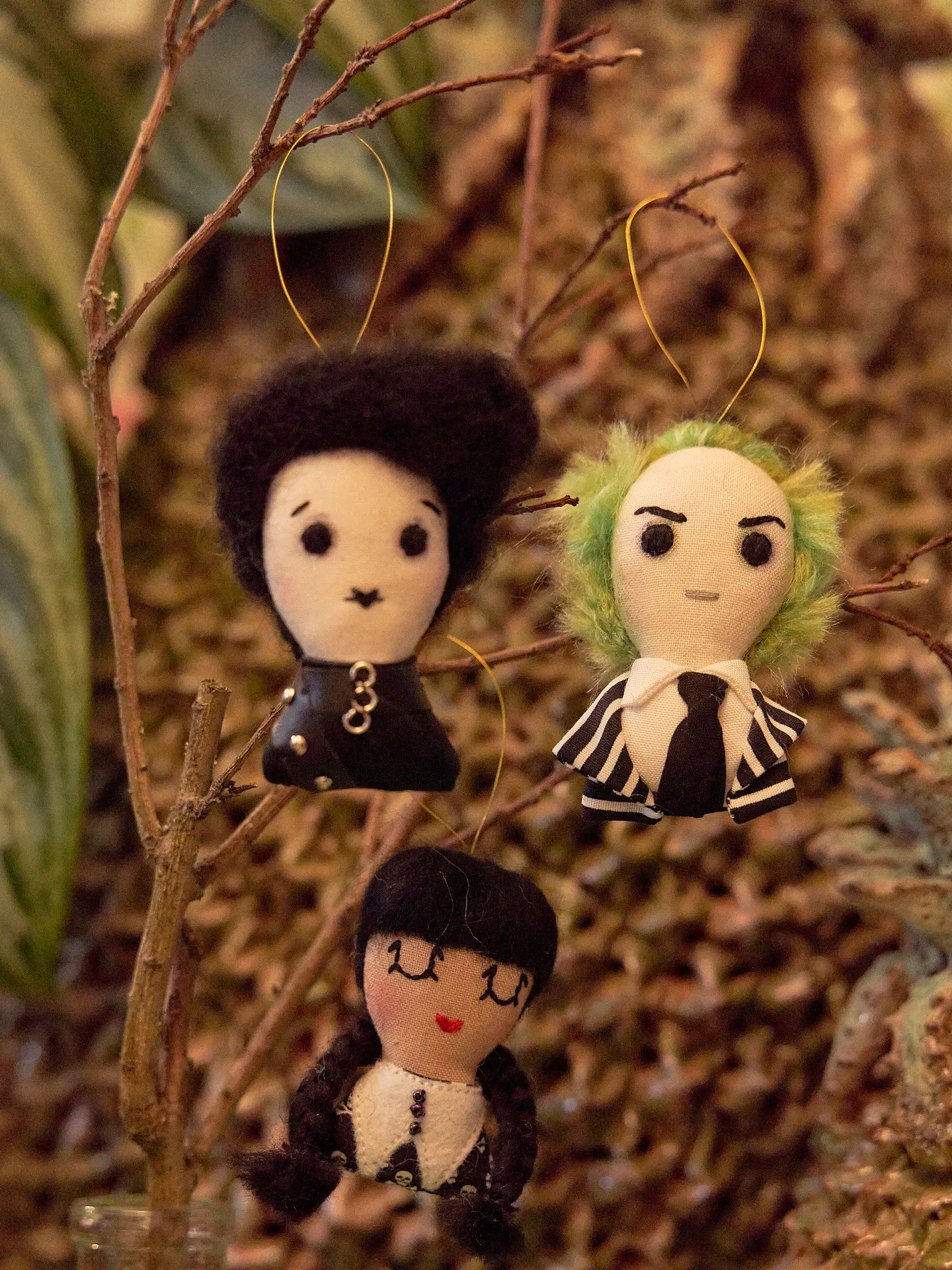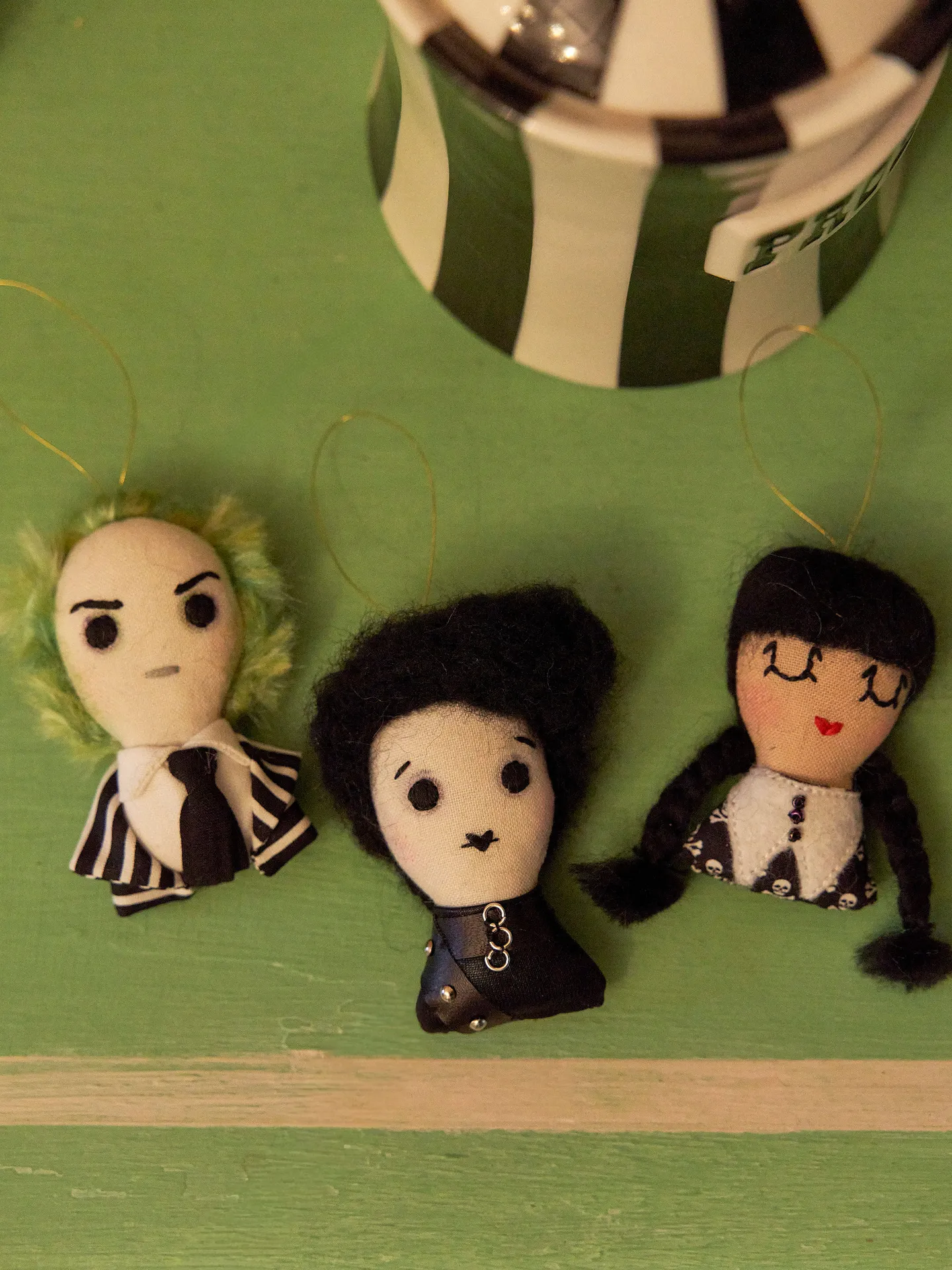 The ultimate set for the Tim Burton fans in your life. This trio of decorations includes Beetlejuice, Edward Scissorhands and Wednesday Addams crafted from cotton, with merino wool needlefelted hair.