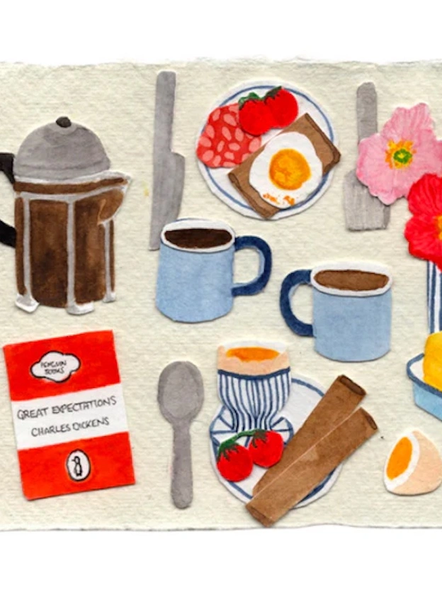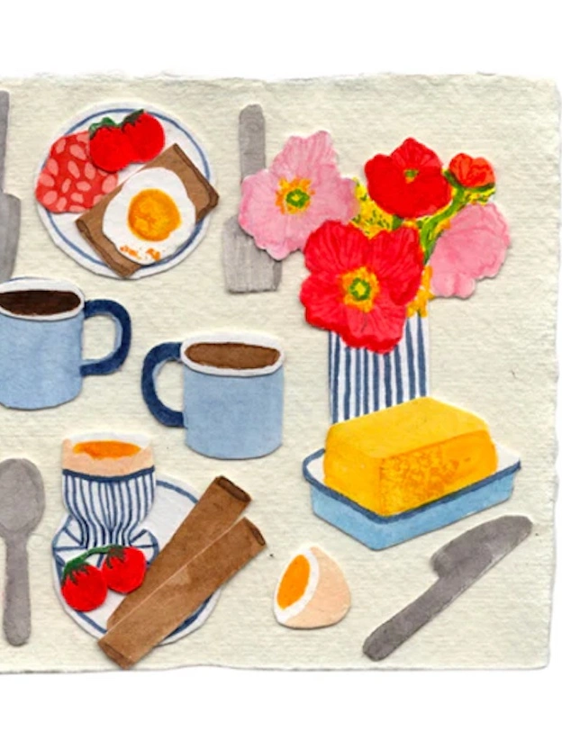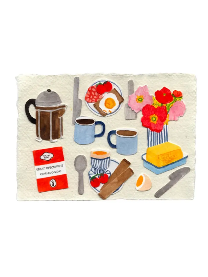 Printed card of an original hand illustrated collage of a breakfast scene.