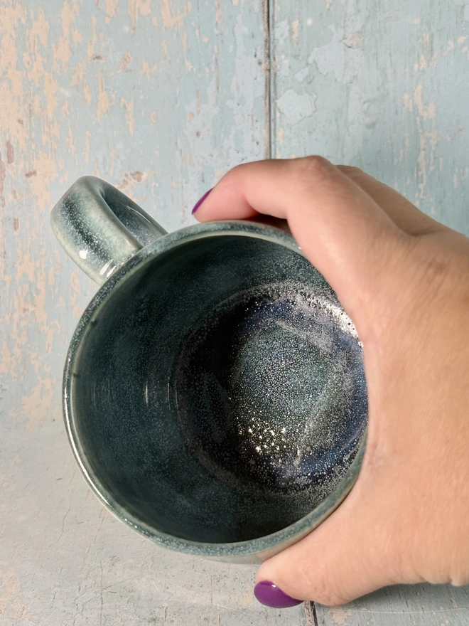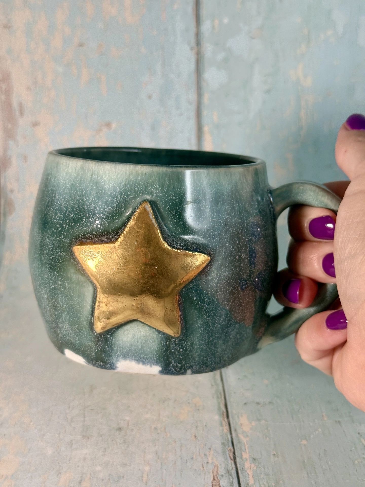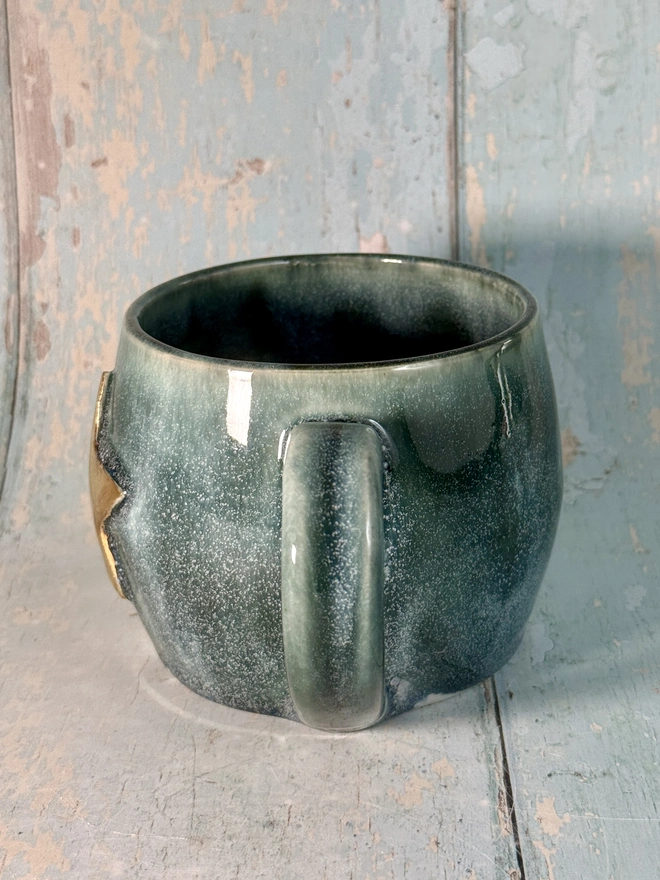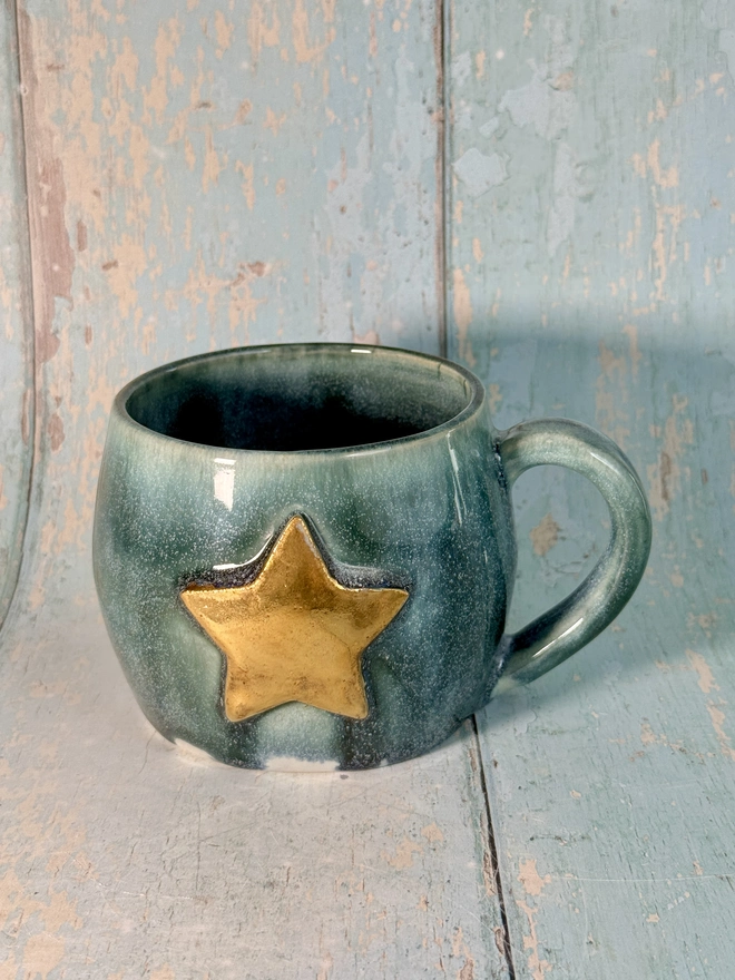 This green star mug is made from white stoneware clay, with a real gold Star.