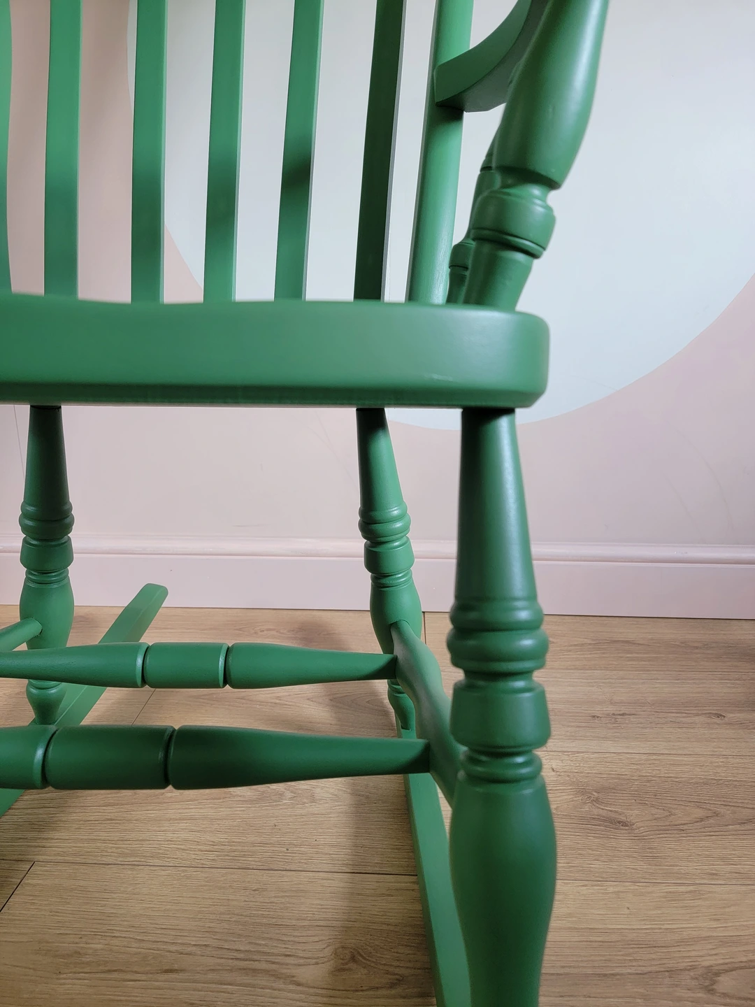All the furniture pieces we work with have had a life before we get our hands on them. They will never look brand new or have a factory-perfect finish. There will be imperfections and ageing, and they are hand finished - but that's what makes each piece special and why refinished preloved furniture has soul. We always choose and finish our pieces carefully, so they will last for many years to come. Approximate measurements: 110cm high x 70cm wide x 90cm deep. Please note, with the rocking motion they do need a bit of space behind them.