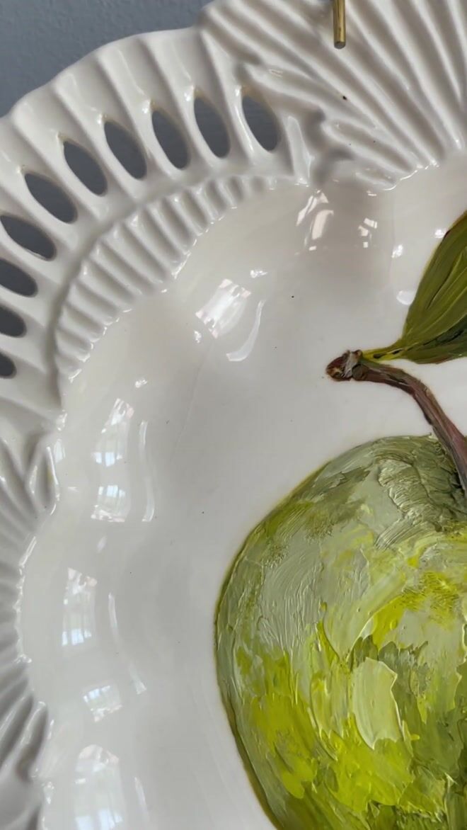 An original fine art painting featuring a green apple. Oil painting by renowned artist Jac Scott, on a vintage reticulated plate made by Royal Creamware, England...