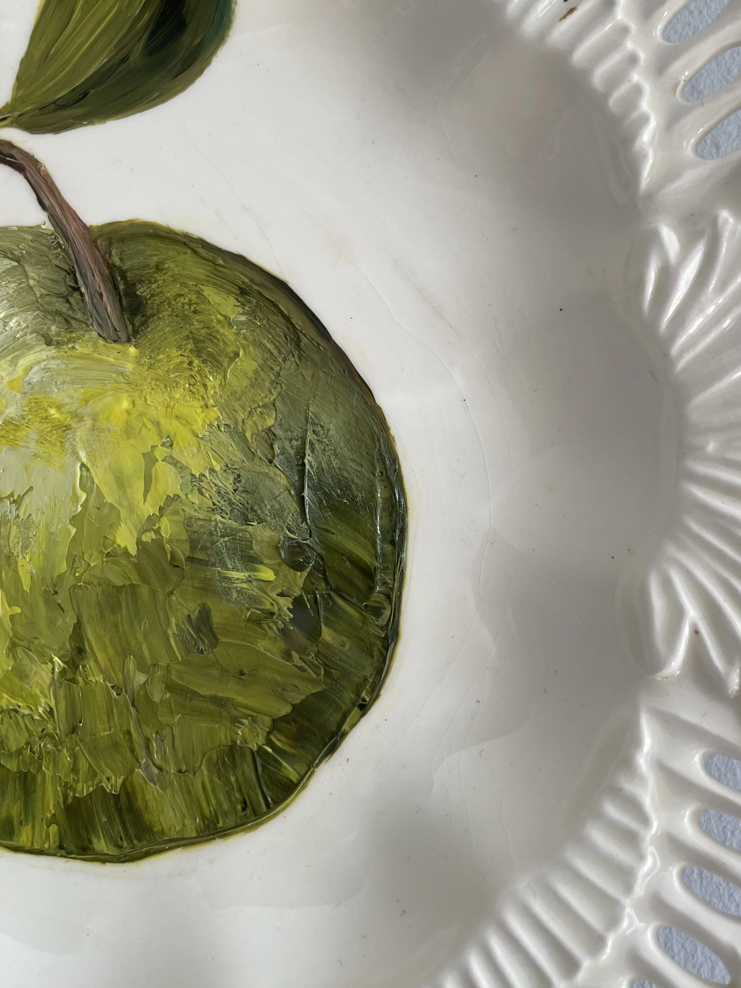 Green Apple Oil Painting On A Reticulated Cream Plate