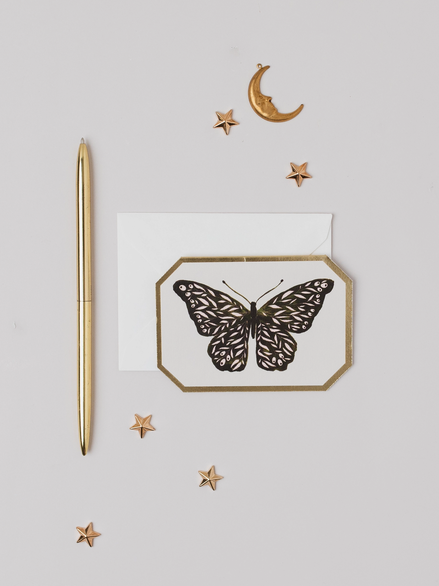 Die cut, delicately foiled mini greeting card with spring botanical butterfly illustration.