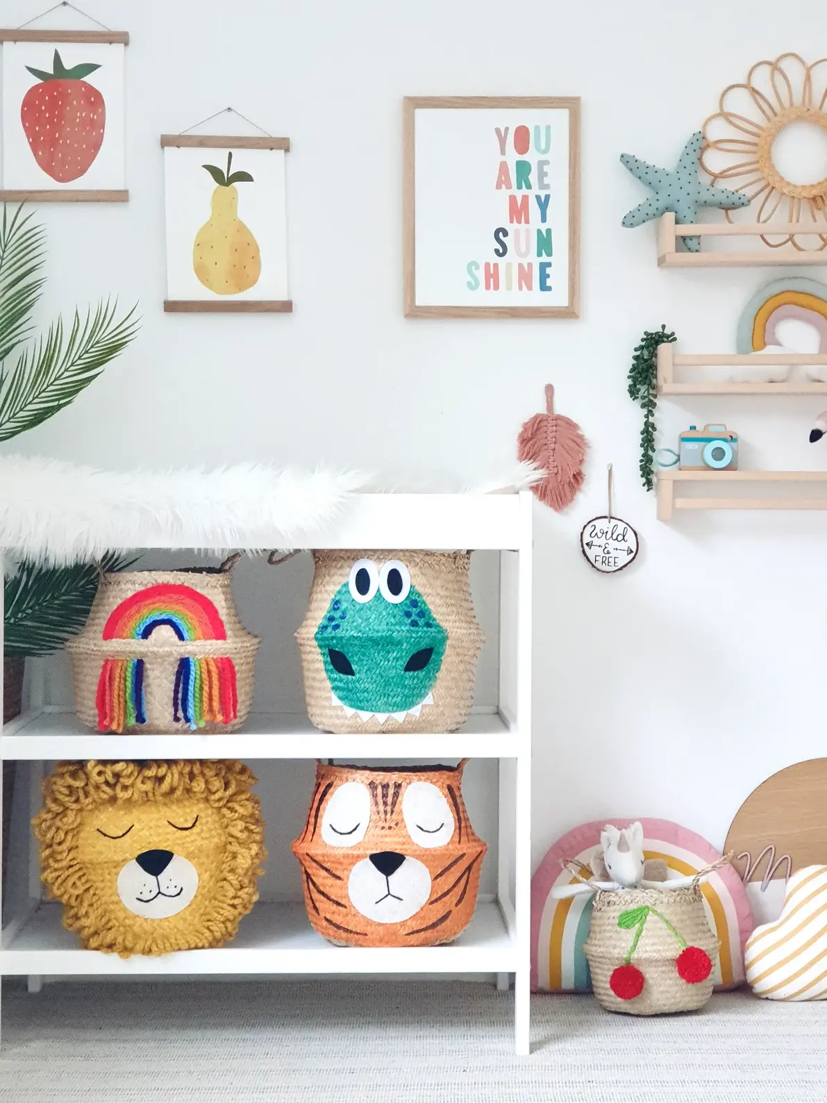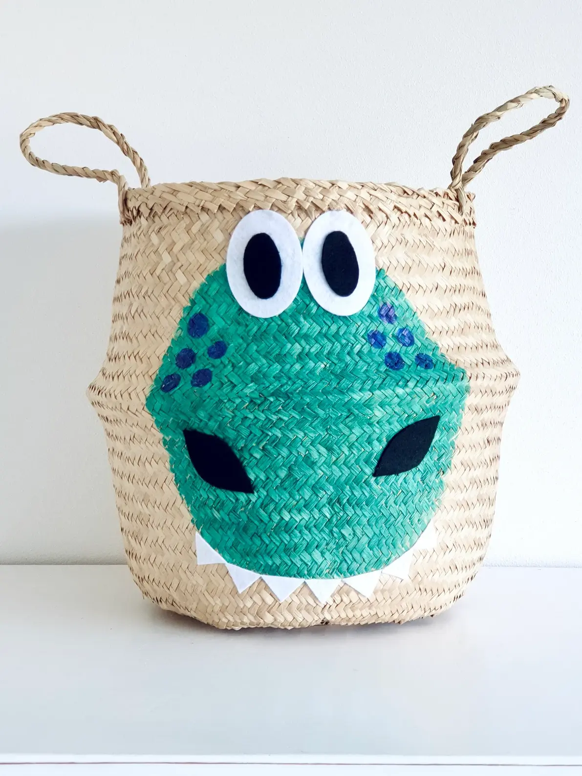 A handmade large seagrass belly basket with a hand painted dinosaur face. A lovely addition to your dino lover's bedroom. Perfect for storing toys, Lego or dinosaurs in!