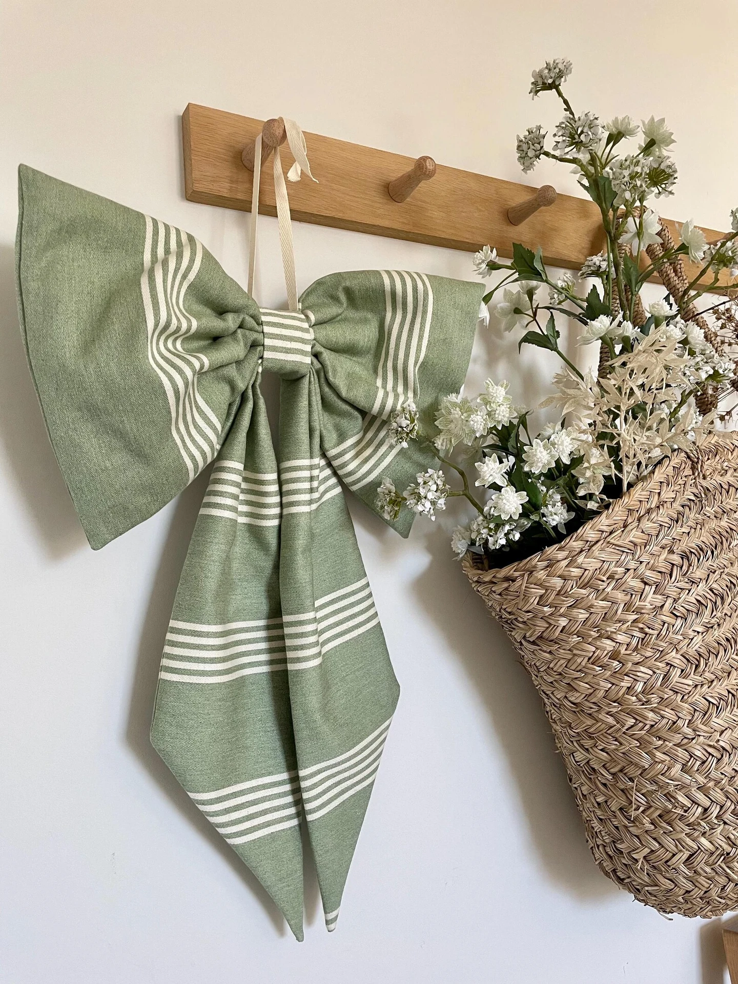 A beautiful oversized bow handmade from an eye-catching sage green and ivory Ian Mankin Oxford stripe cotton fabric...