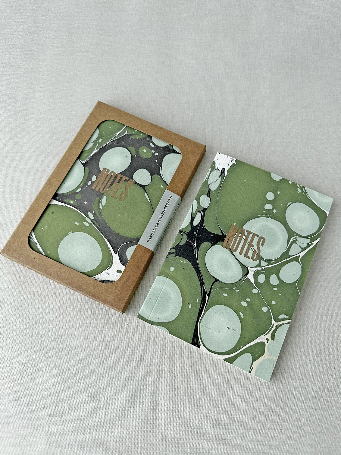 Letterpress printed notebook with an original hand marbled cover on thick handmade paper - each book is unique.