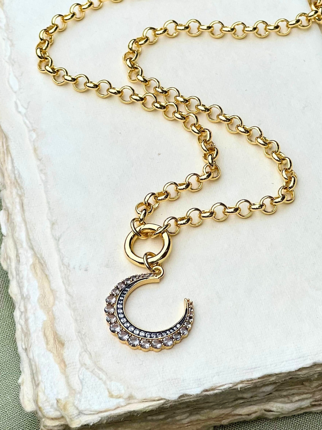 Chain and charms, 18ct gold plated on brass, chain 45cm, crescent moon 25mm.