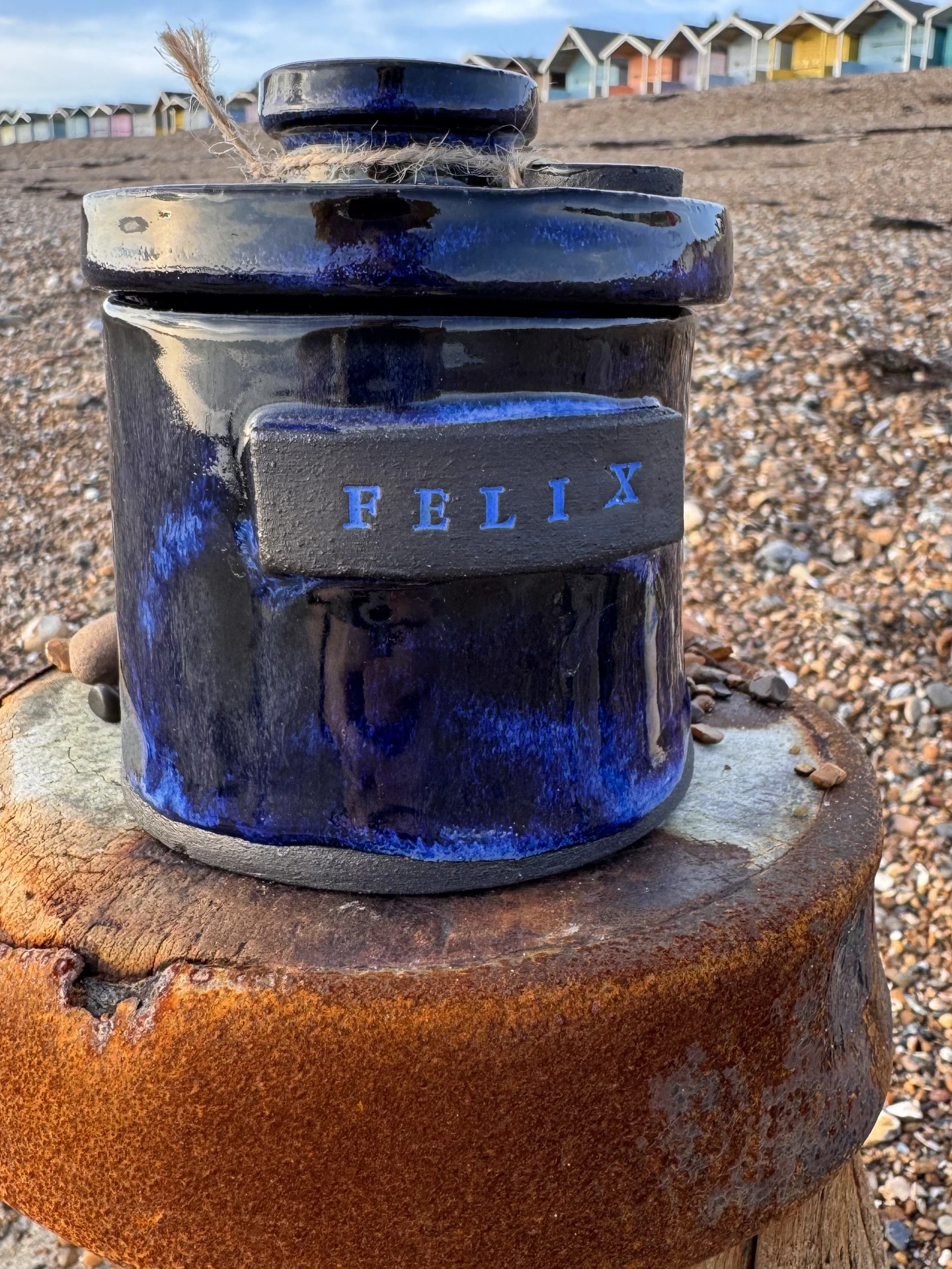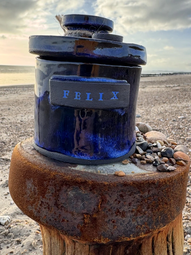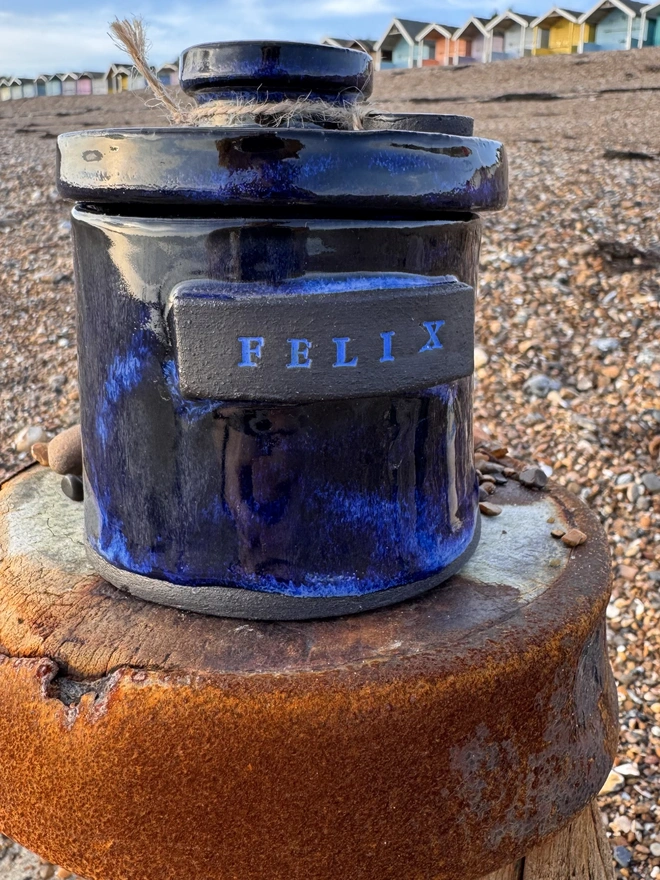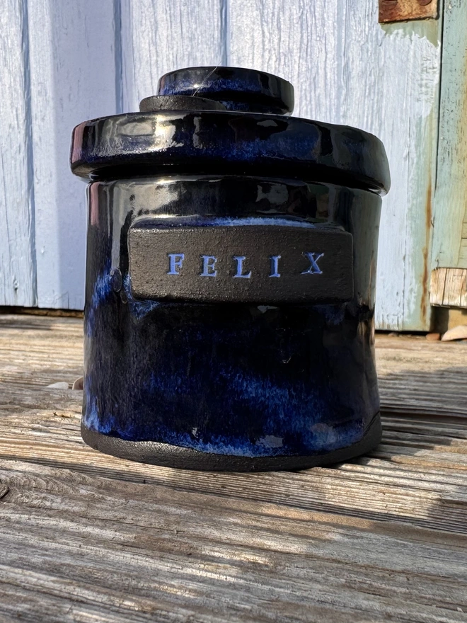 A unique hand built ceramic urn blending timeless design with personal meaning, providing a dignified resting place for your cherished companion.