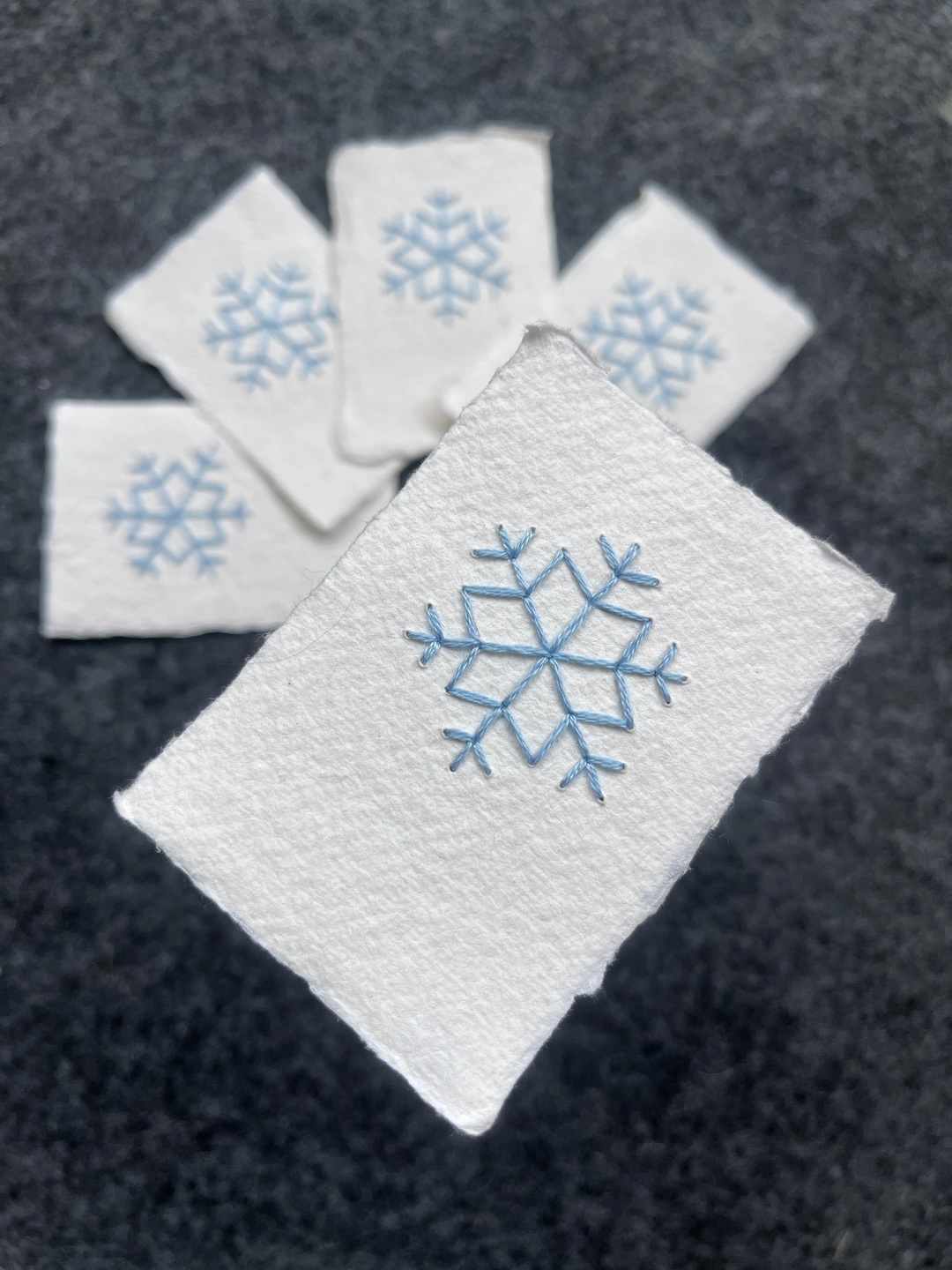 Set of five hand embroidered gift tags, each depicting a delicate snowflake design.