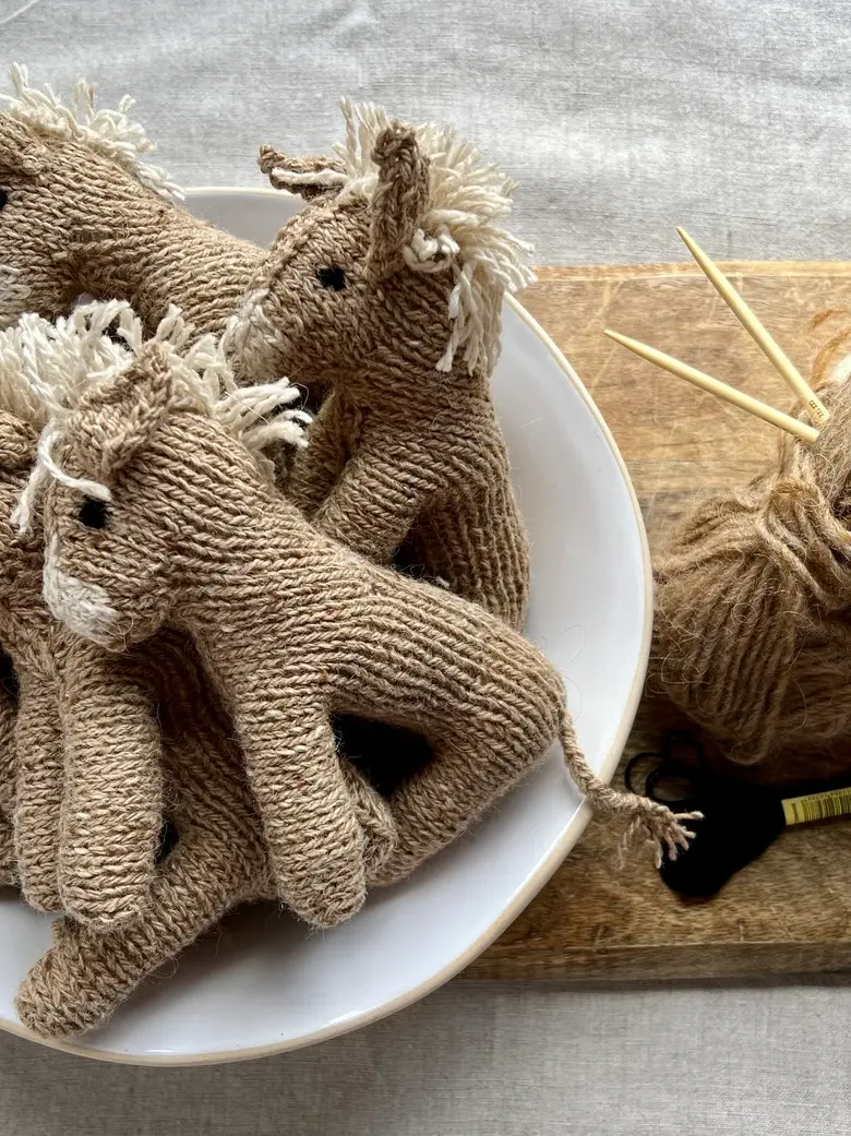 Small enough to slip into a pocket or rest comfortably in a little hand, Edwin is hand knitted from beautifully hand-dyed wool and alpaca yarn. He’s lightly filled with a thoughtful blend of pure wool and acrylic toy stuffing, giving him a soft yet reassuring feel. Finished with silk-embroidered eyes, a contrasting cream muzzle, and his naturally wayward mane and tail, Edwin is full of character and quiet charm.