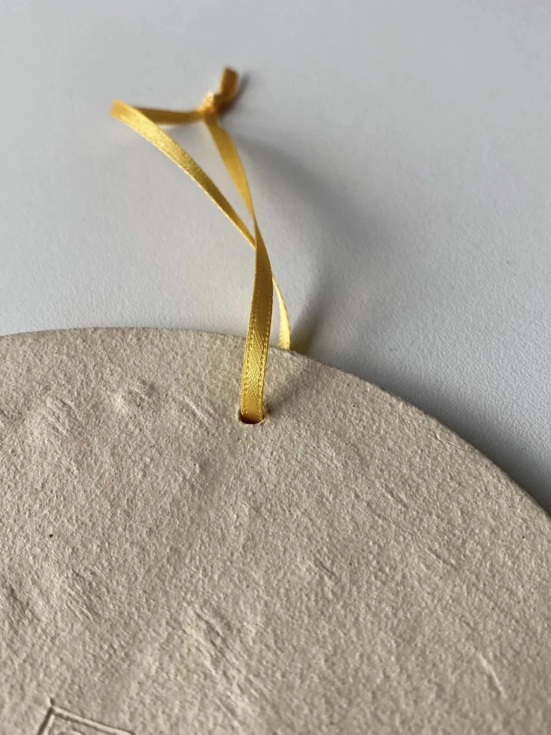Ceramic wall hanging Sun, made by cutting out a circular piece of a slab of clay. Hand painted with slip and underglaze whilst the clay is leather hard. I've added some texture by pressing small shapes into the clay. Once dry the sun hanging is bisque fir...