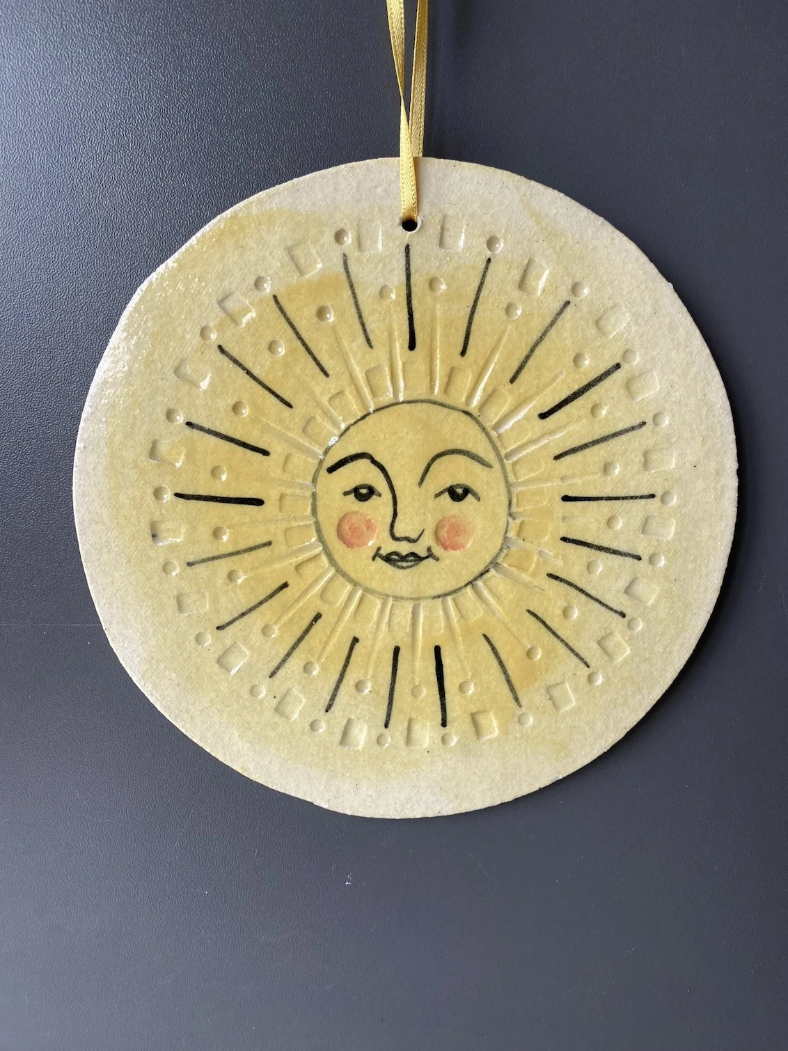 Ceramic wall hanging Sun, made by cutting out a circular piece of a slab of clay. Hand painted with slip and underglaze whilst the clay is leather hard. I've added some texture by pressing small shapes into the clay. Once dry the sun hanging is bisque fired and then covered in lovely shiny clear glaze and high fired to 1260 degrees in the kiln.