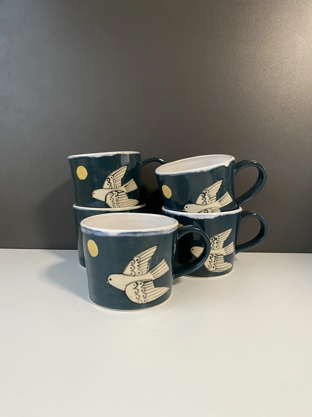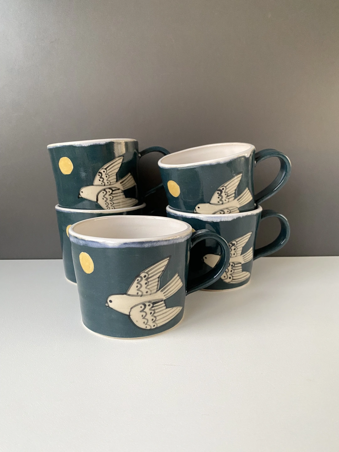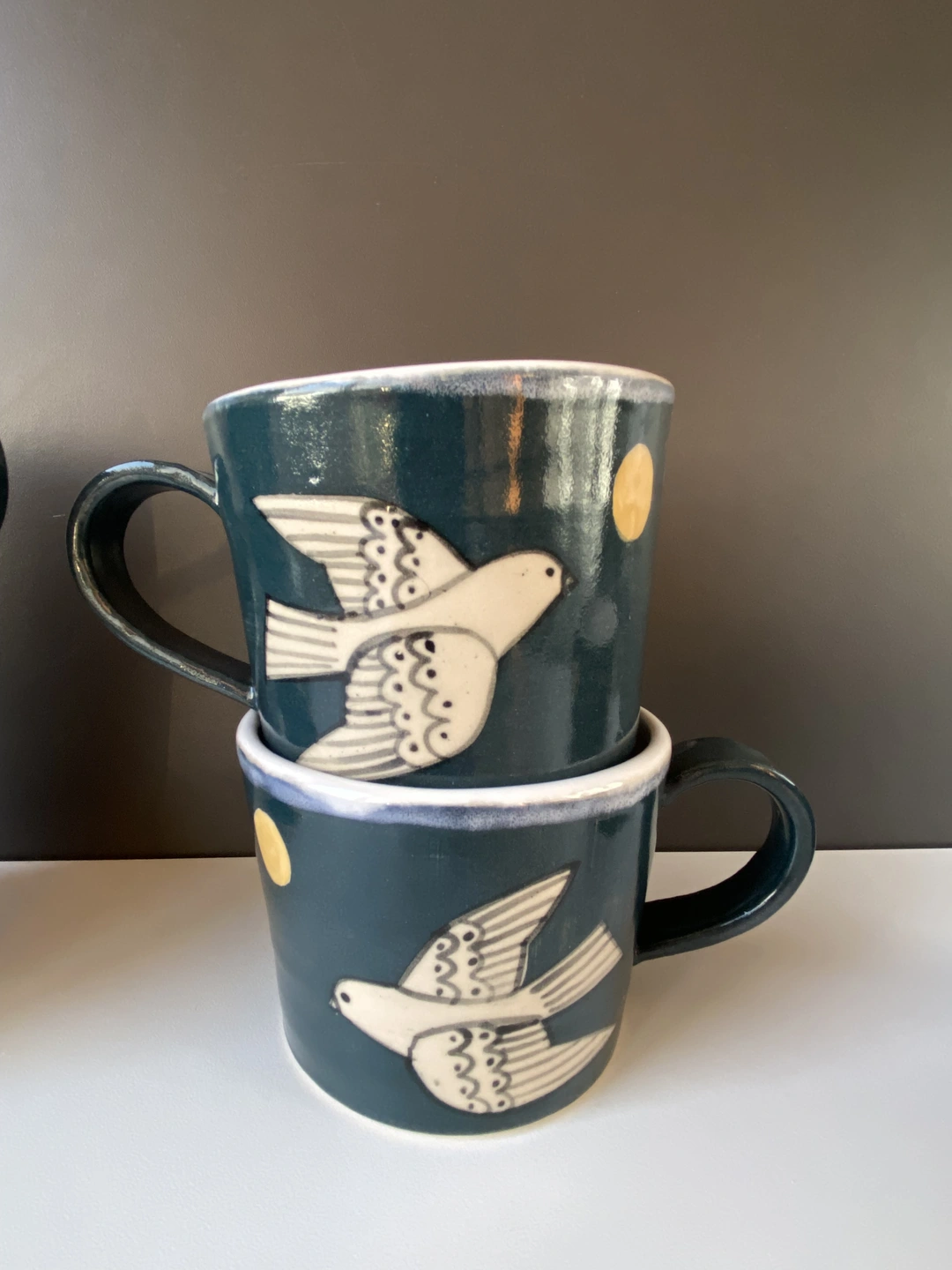 Wheel thrown medium sized mug decorated with a mid century folk inspired white bird against a dark blue background. Use of slips and underglaze to hand paint the blue colour and details on the bird. The outside has a clear glaze finish and the inside a wh...