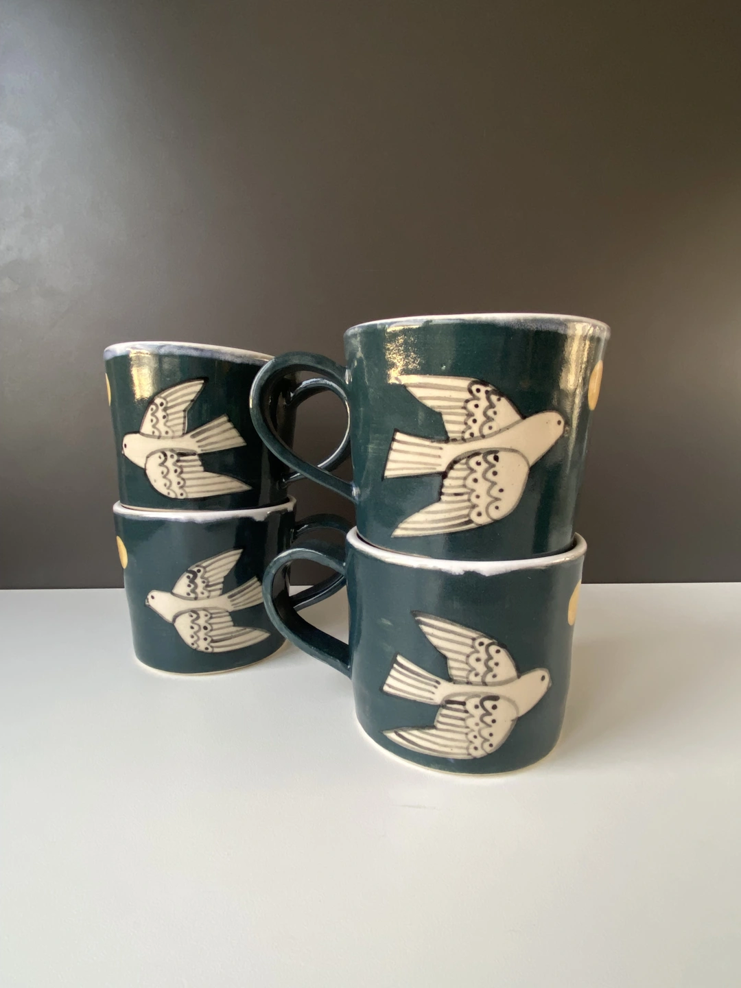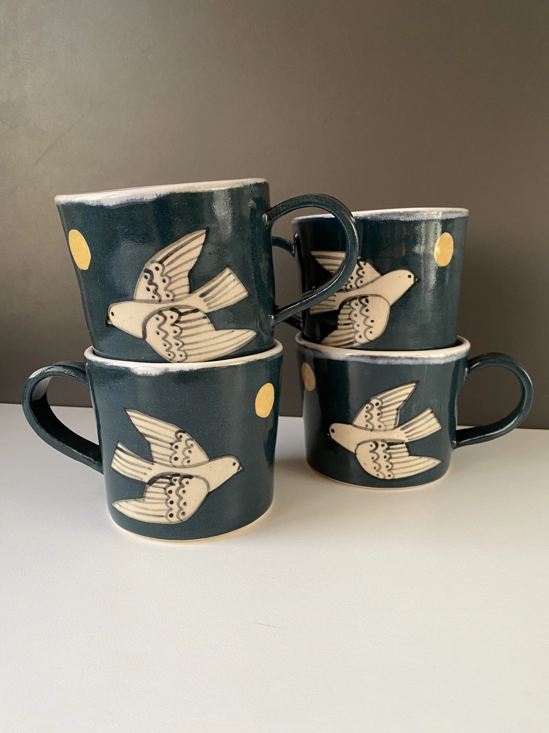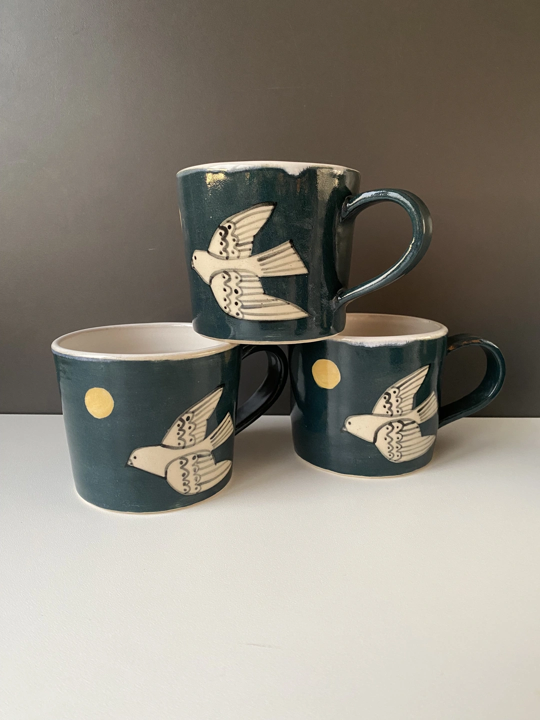 Wheel thrown medium sized mug decorated with a mid century folk inspired white bird against a dark blue background. Use of slips and underglaze to hand paint the blue colour and details on the bird. The outside has a clear glaze finish and the inside a wh...