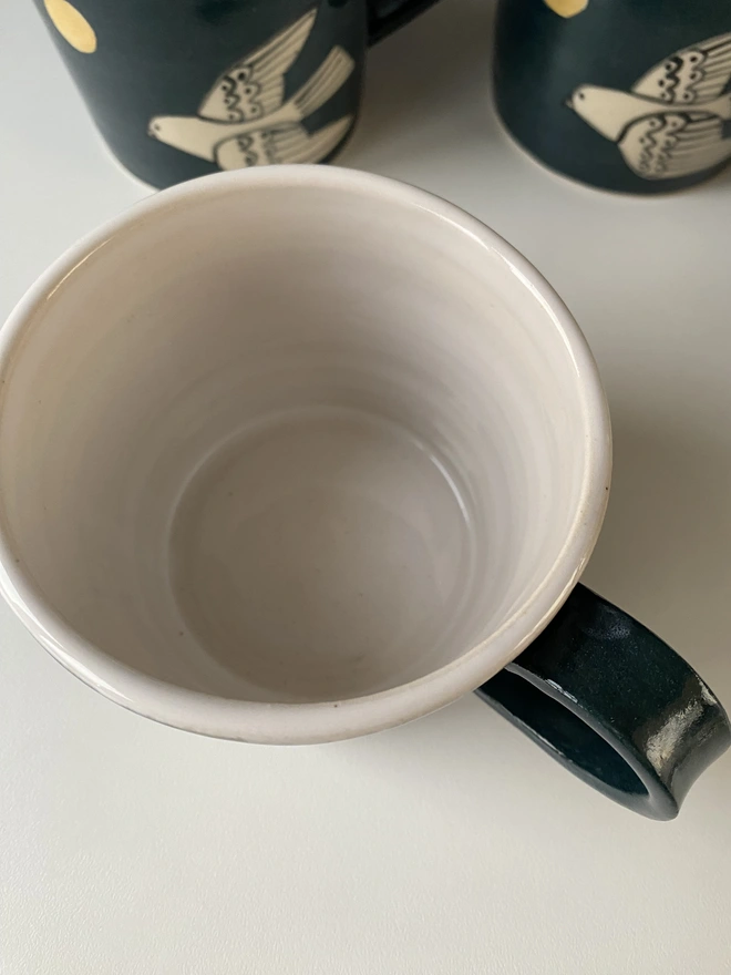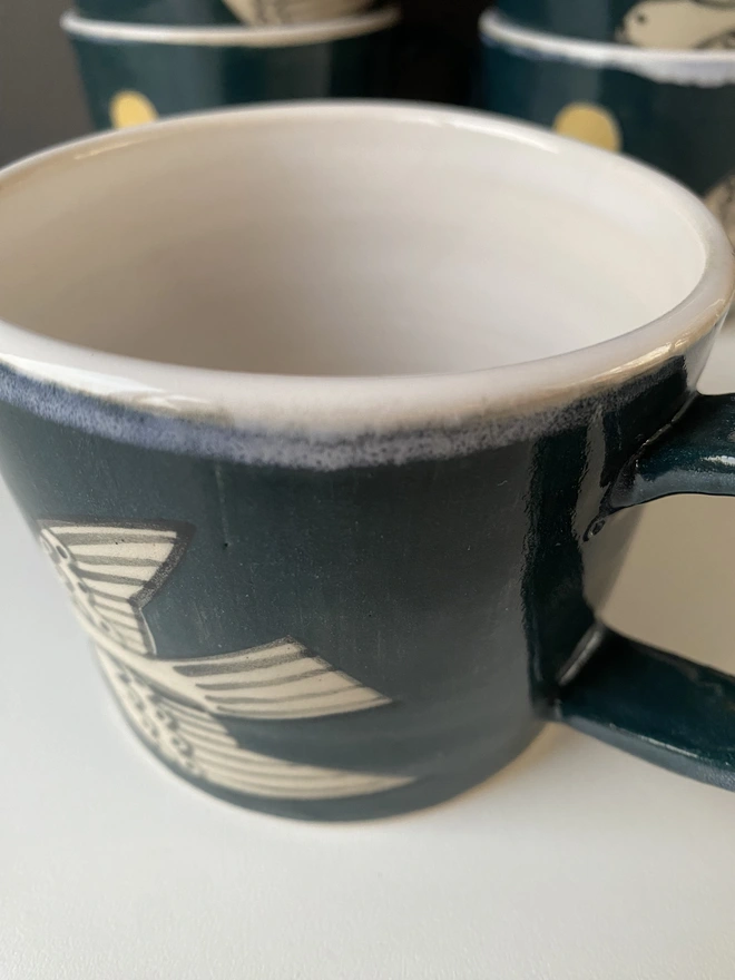 Wheel thrown medium sized mug decorated with a mid century folk inspired white bird against a dark blue background. Use of slips and underglaze to hand paint the blue colour and details on the bird. The outside has a clear glaze finish and the inside a white shiny glaze which has run a little over the edge.