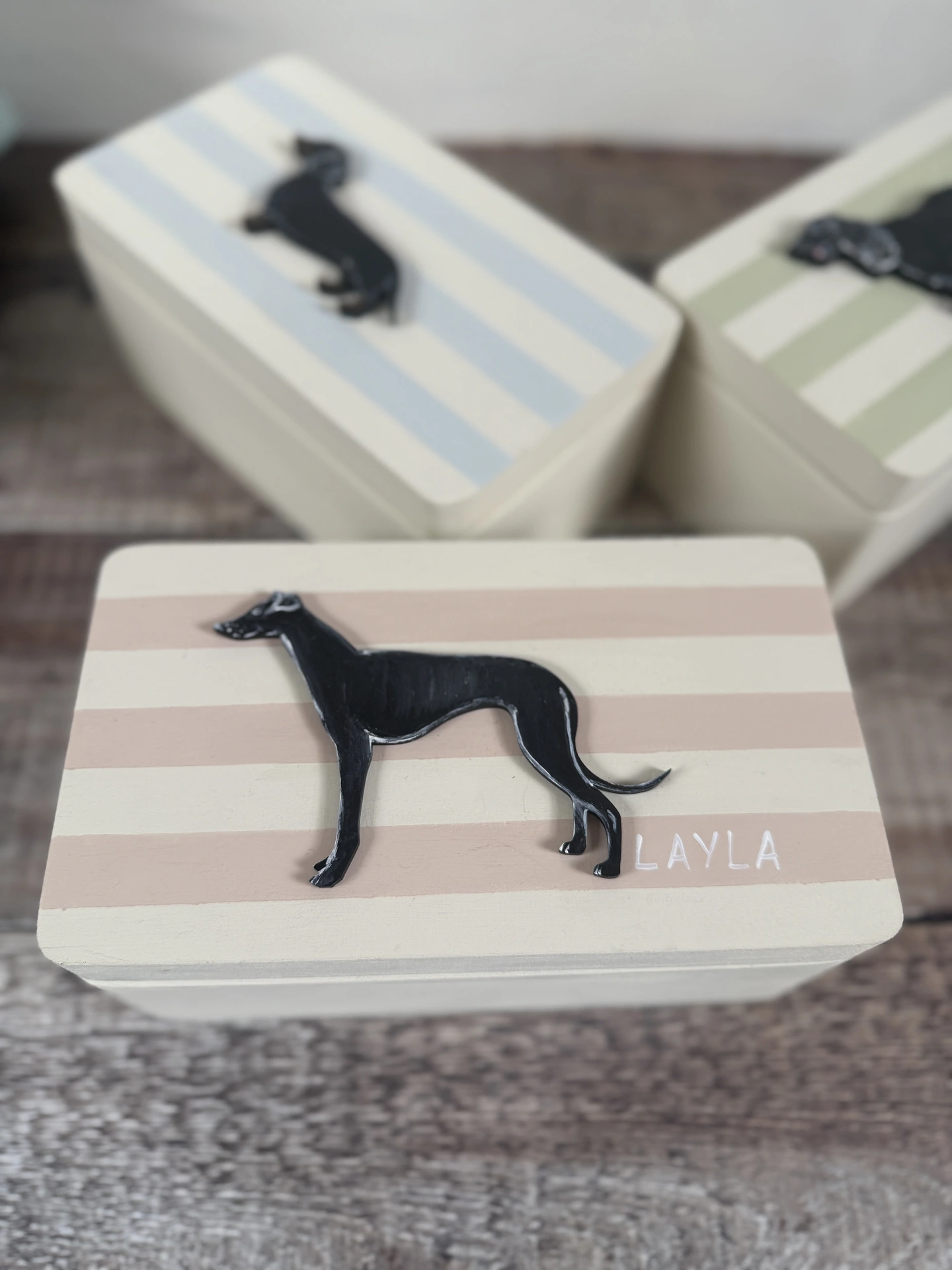 It is painted on all external sides in Farrow and Ball off white paint, with the choice of pink and white, green and white or blue and white stripes - and with or without your pet's name. ( please see the example of Layla the dog for how the name will be painted in white)