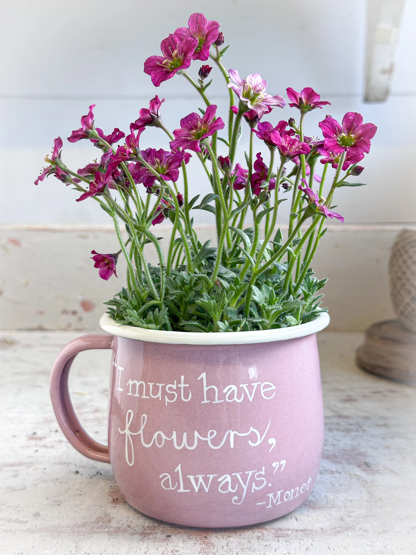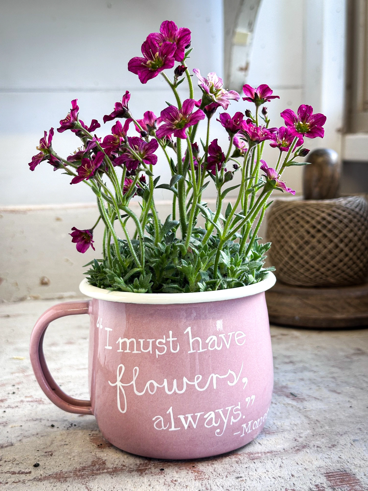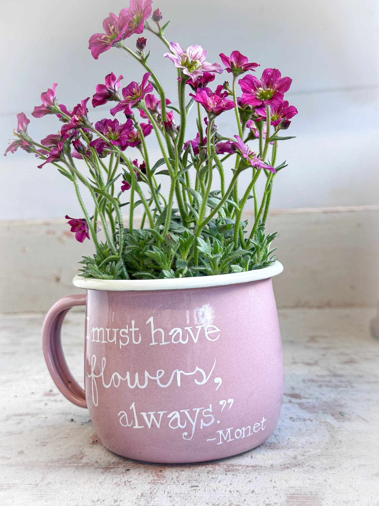 Hand-Painted Enamel Belly Mug Planter “I Must Have Flowers”