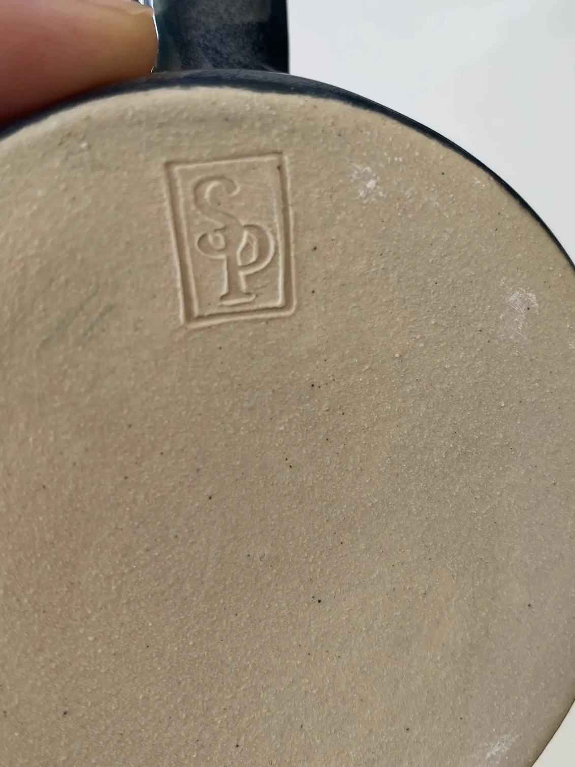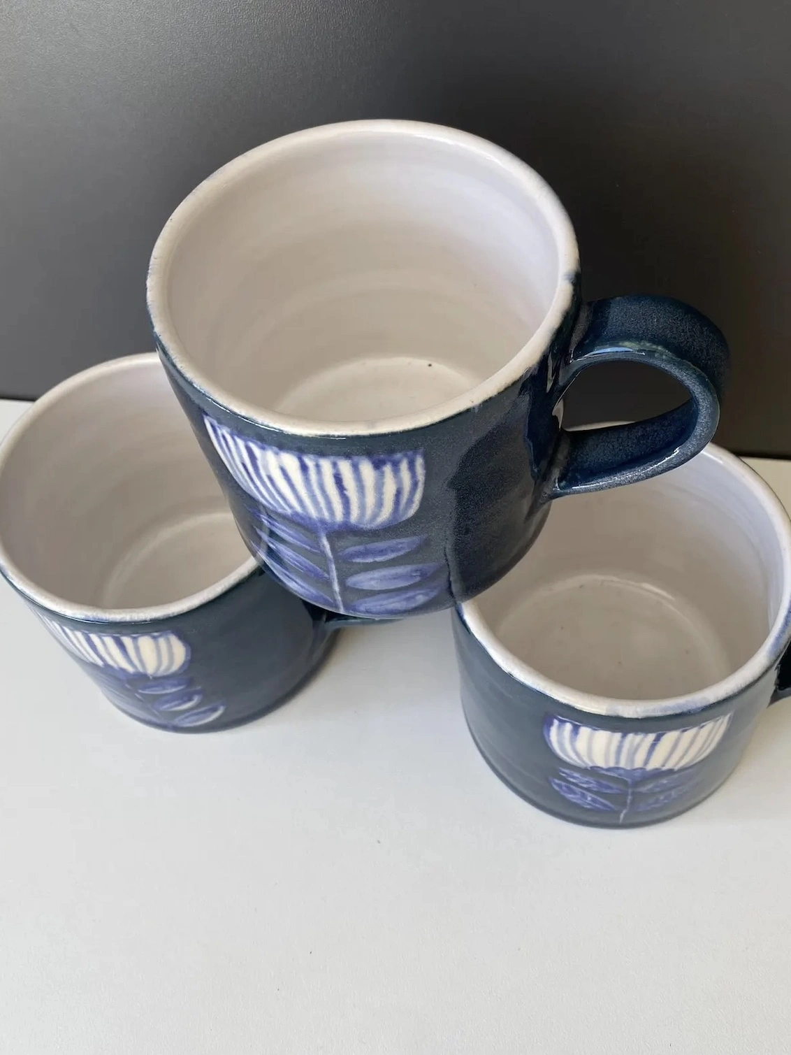 Mug with blue flowers on either side, on a dark teal background. Wheel thrown with a white stoneware clay. Decorated with slips, paper decals and underglaze at green ware stage. Bisque fired and then glaze fired to a temperature of 1260 degrees which make...