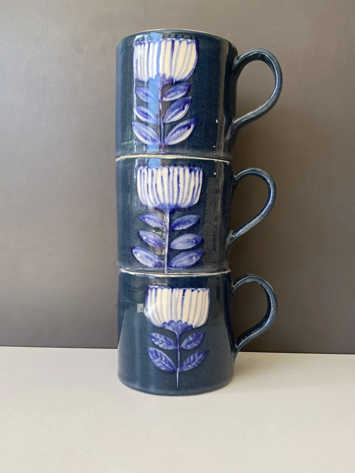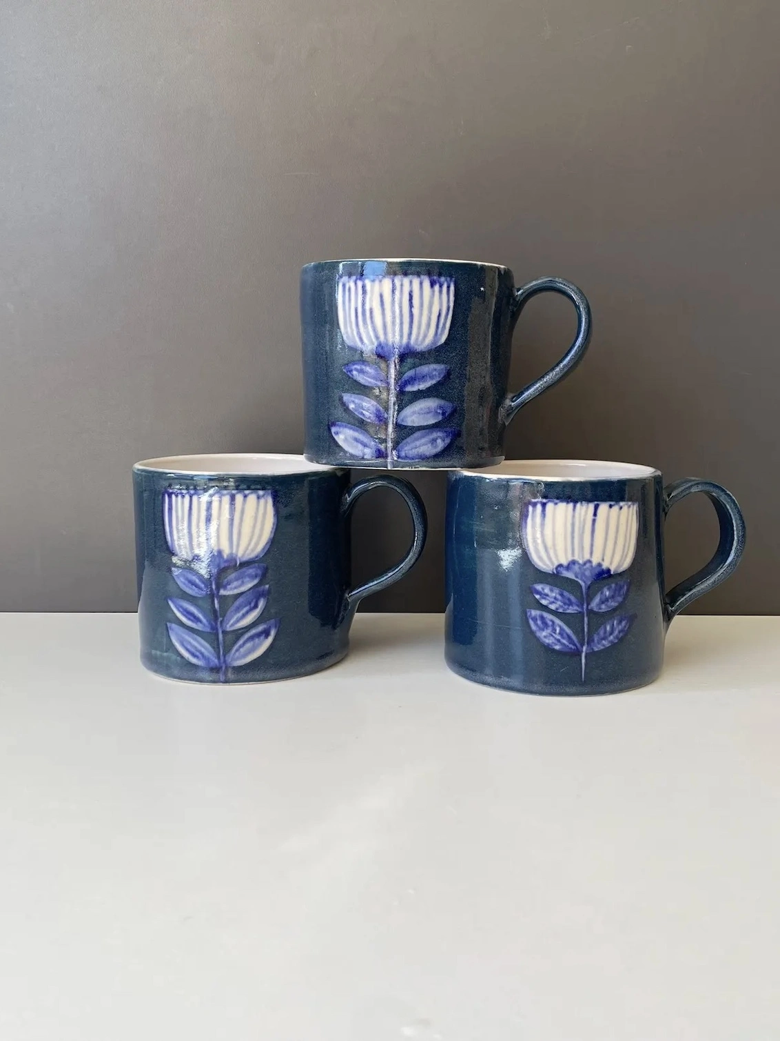 Mug with blue flowers on either side, on a dark teal background. Wheel thrown with a white stoneware clay. Decorated with slips, paper decals and underglaze at green ware stage. Bisque fired and then glaze fired to a temperature of 1260 degrees which makes this mug fit for purpose and functional. Clear glaze on the outside and a white tin glaze on the inside.