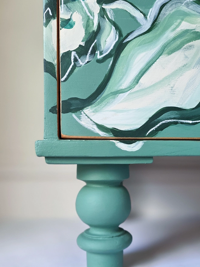 This hand-painted design is entirely bespoke and as mentioned completely unique, with a carefully selected colour palette of monochrome tones in cream, white and green; then sealed to finish and protect with a clear top coat.