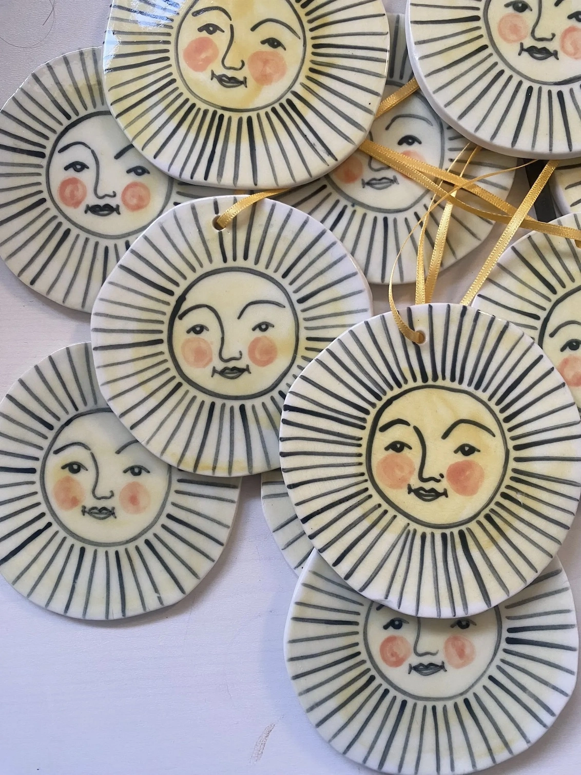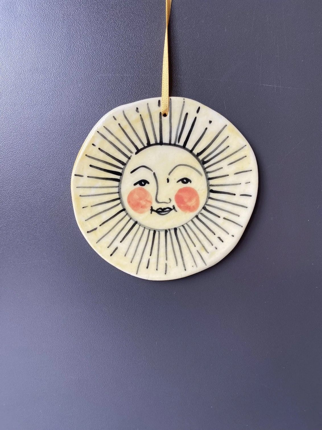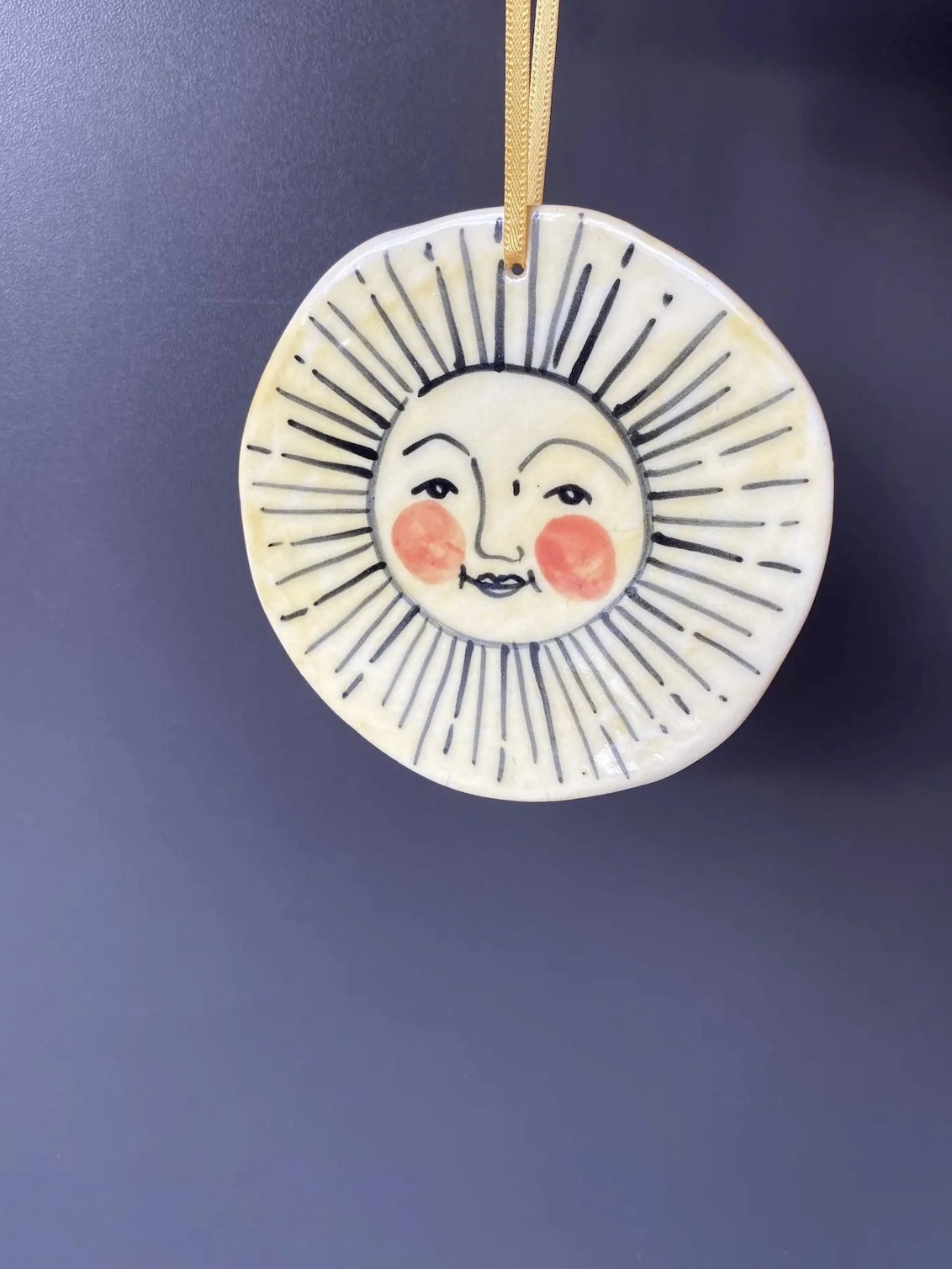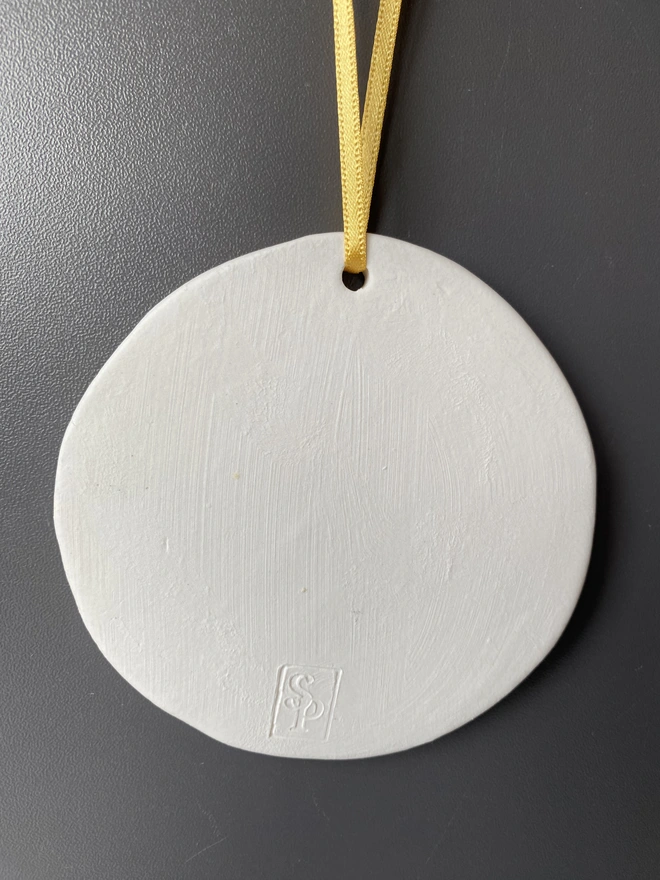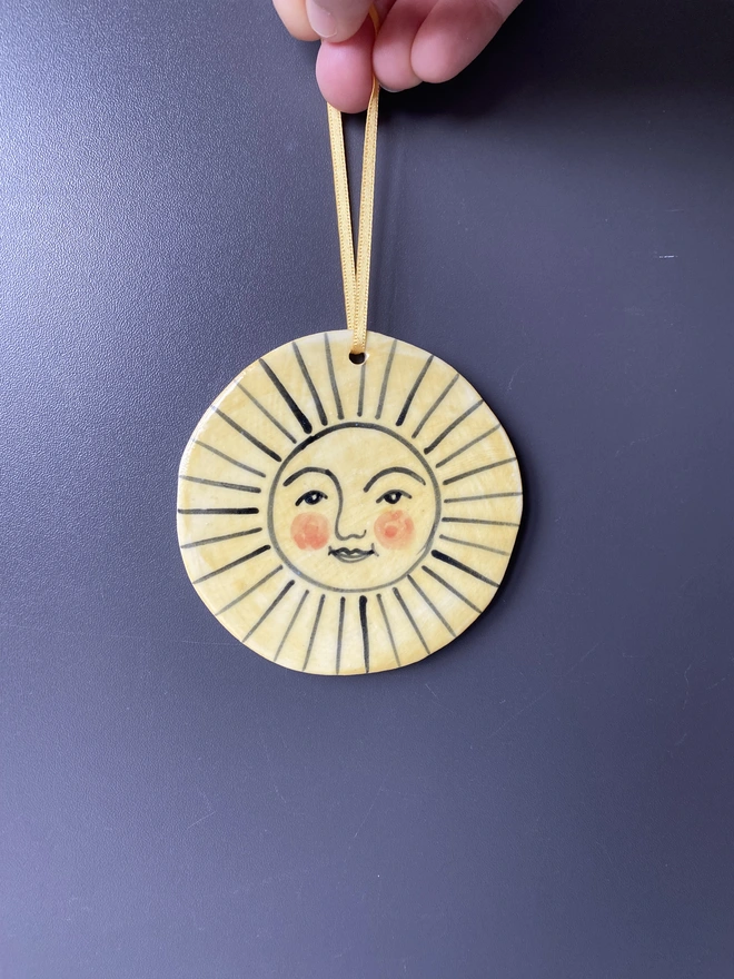 Ceramic porcelain hanging Sun, made by cutting out a circular piece of a slab of clay. Hand painted with slip and underglaze whilst the porcelain is leather hard and then bisque fired once dry. Once out the bisque kiln the porcelain suns are glaze fired at a high fired temperature of 1270 degrees.