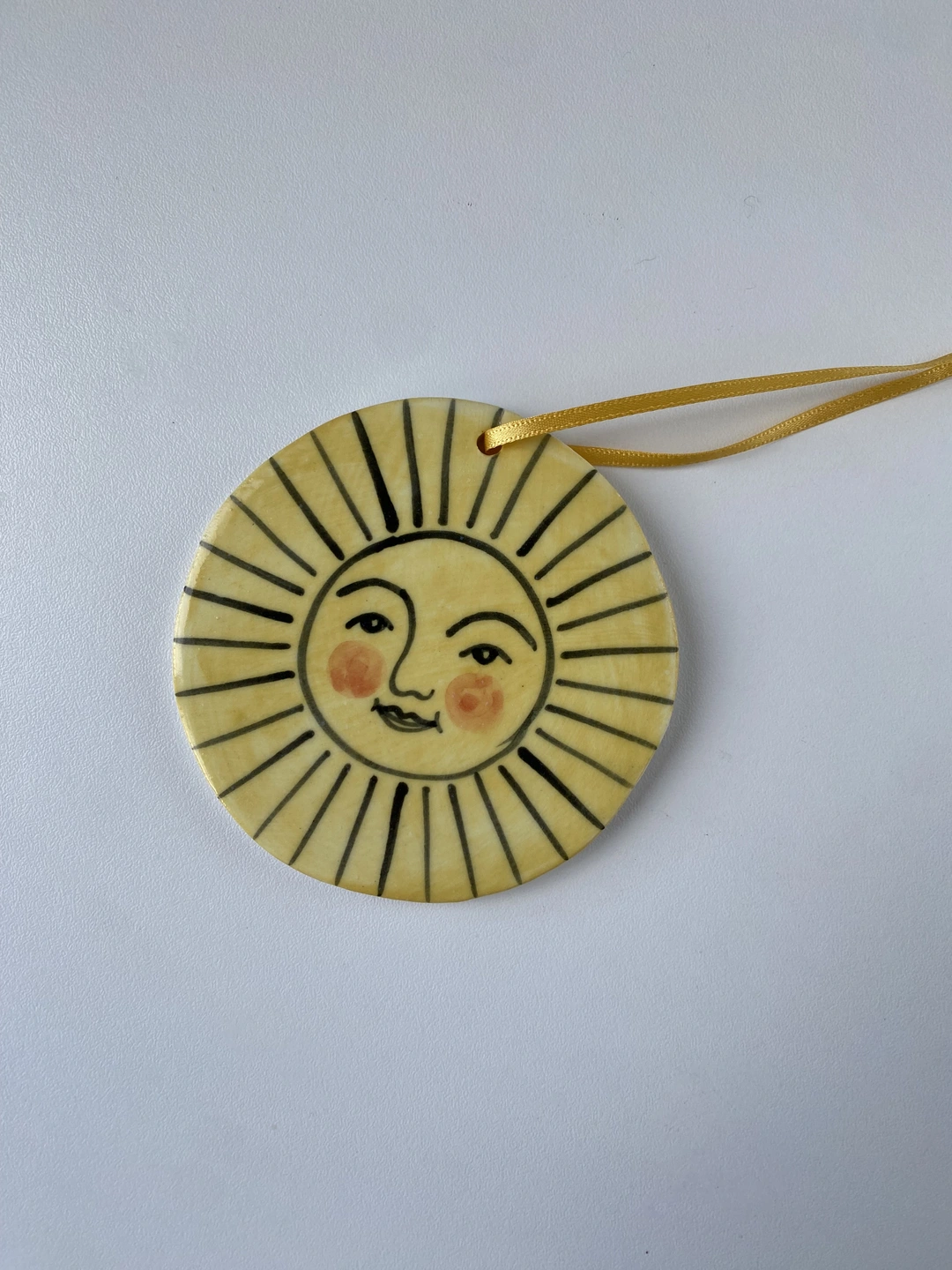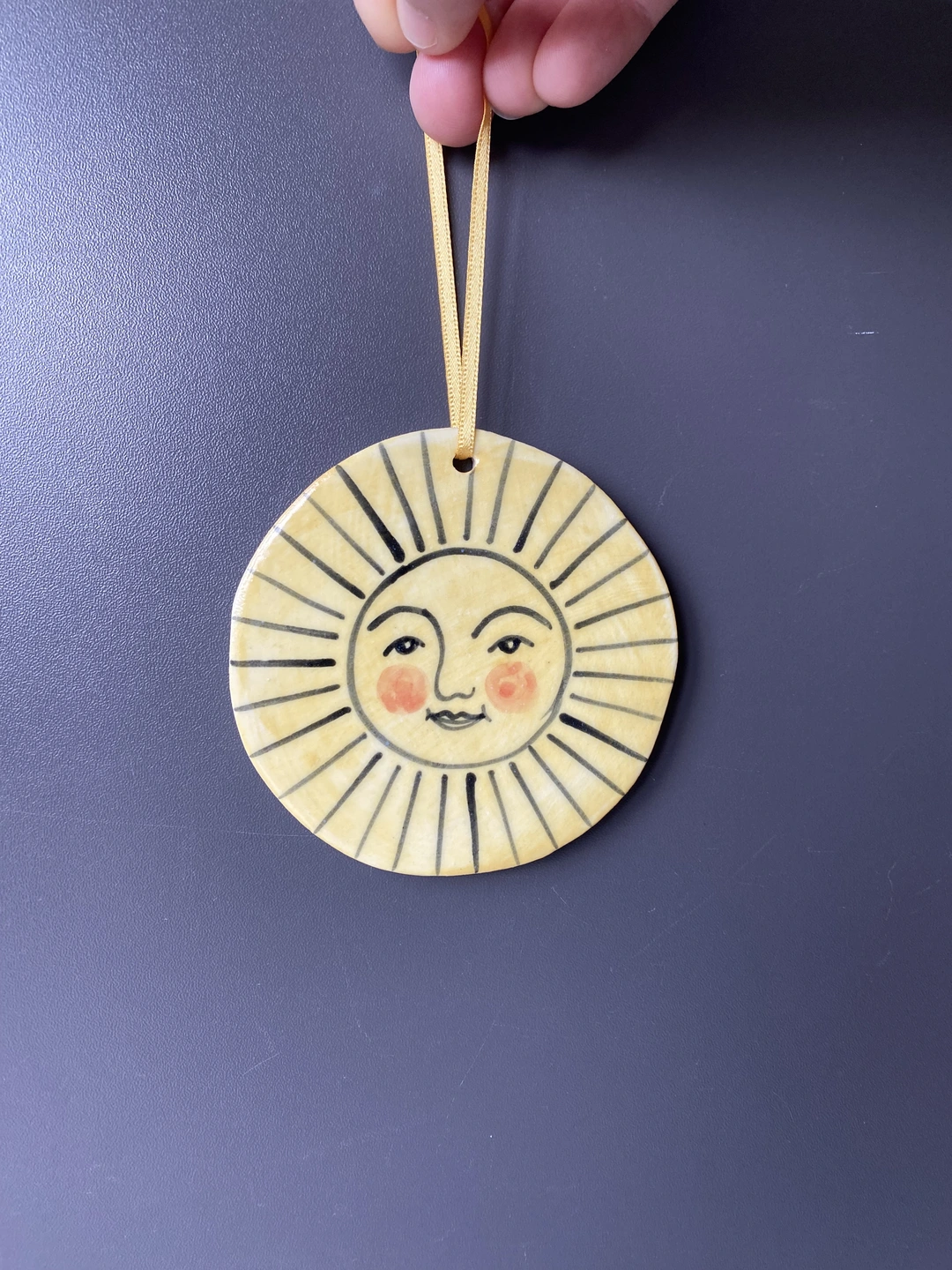 Ceramic porcelain hanging Sun, made by cutting out a circular piece of a slab of clay. Hand painted with slip and underglaze whilst the porcelain is leather hard and then bisque fired once dry. Once out the bisque kiln the porcelain suns are glaze fired a...
