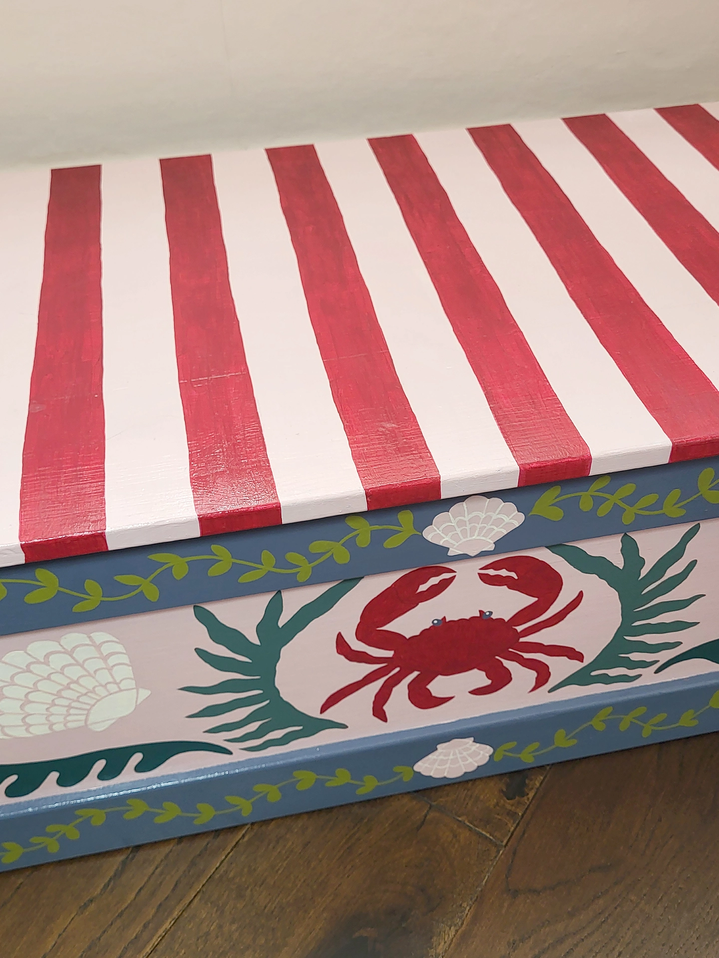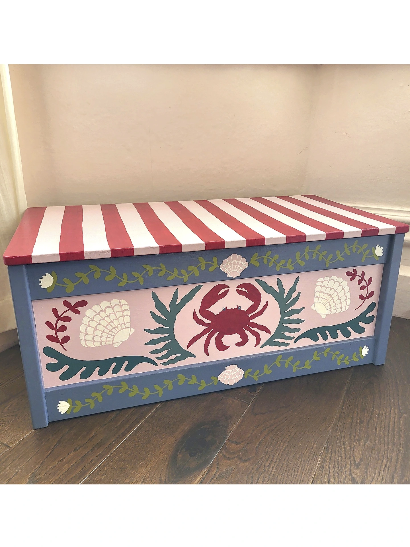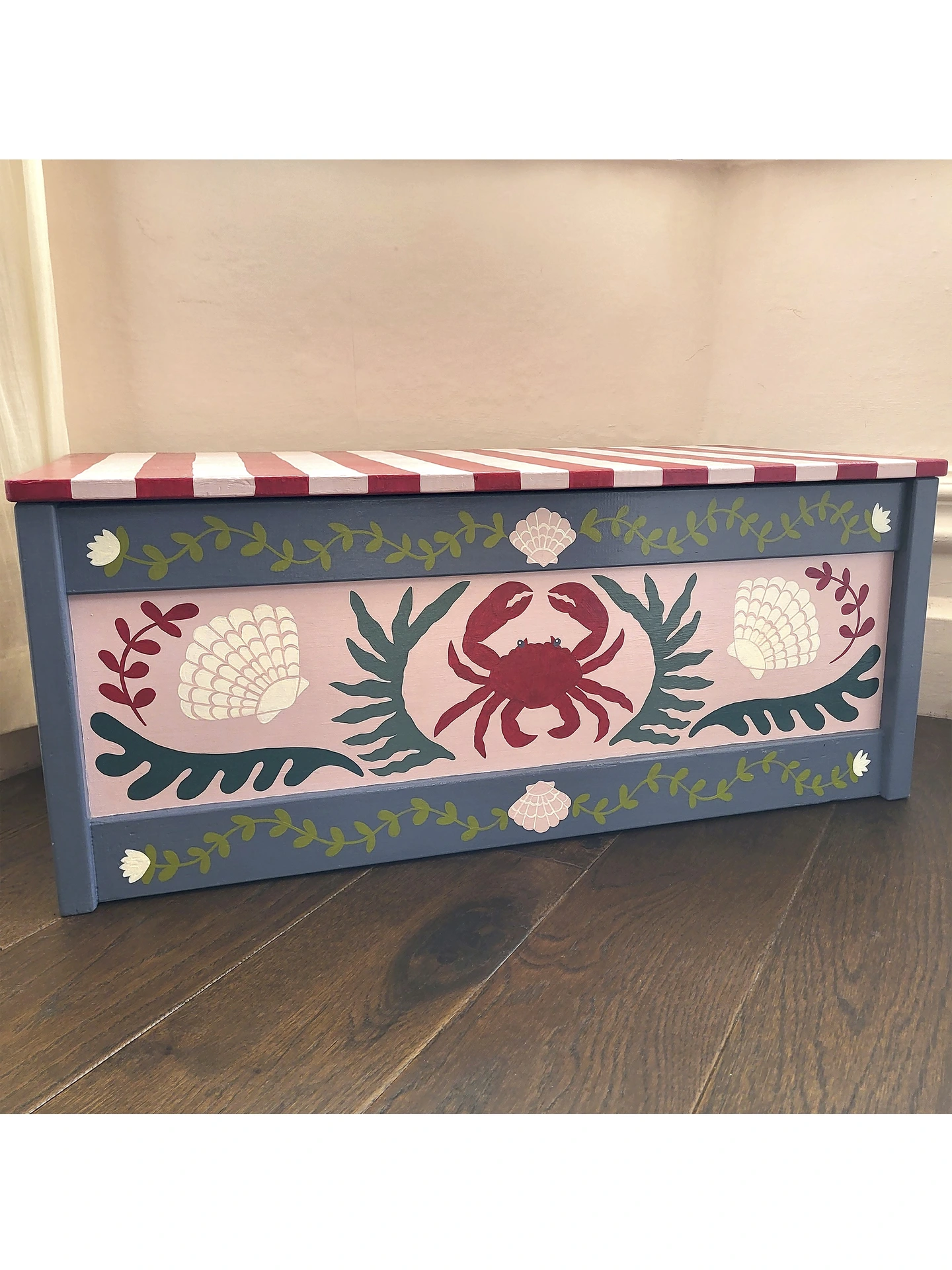 An original, hand-painted wooden chest, sourced from vintage and thoughtfully reimagined. Dottie & Cloud's signature crab, shell and seaweed motifs feature in a sophisticated and pretty palette of soft pink, grey and deep sea greens. The removable lid is finished in bold red and pink deck chair stripes for a playful contrast.