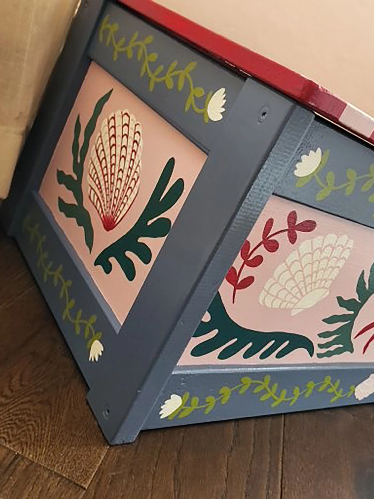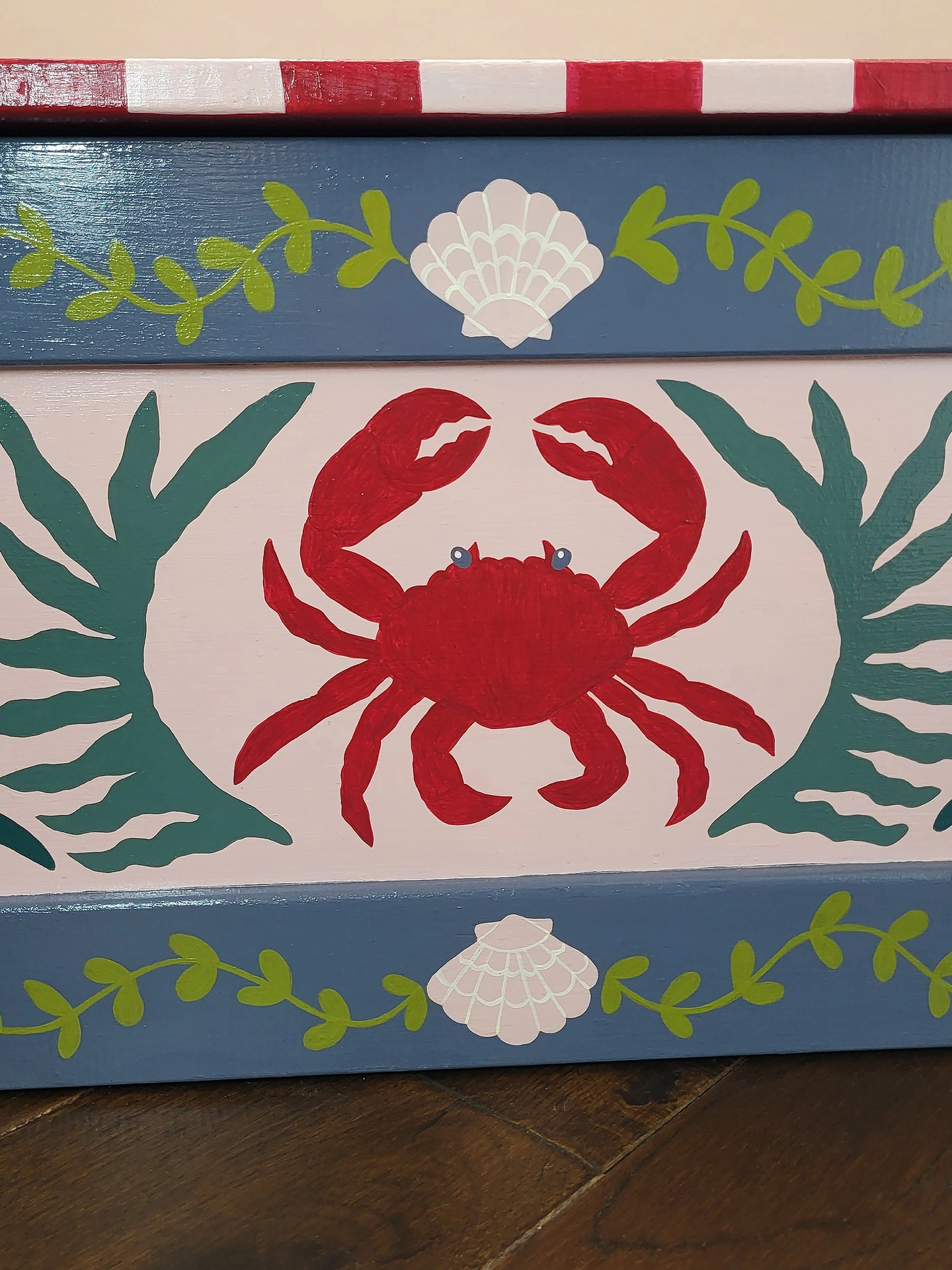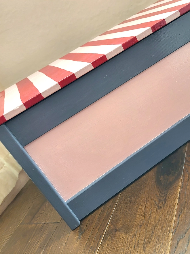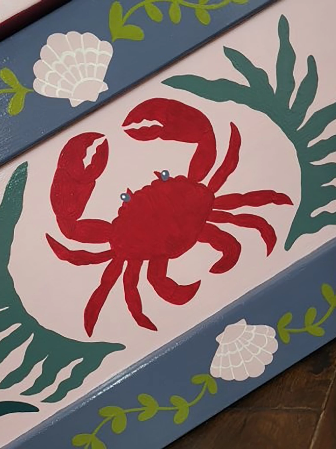 An original, hand-painted wooden chest, sourced from vintage and thoughtfully reimagined. Dottie & Cloud's signature crab, shell and seaweed motifs feature in a sophisticated and pretty palette of soft pink, grey and deep sea greens. The removable lid is finished in bold red and pink deck chair stripes for a playful contrast.
