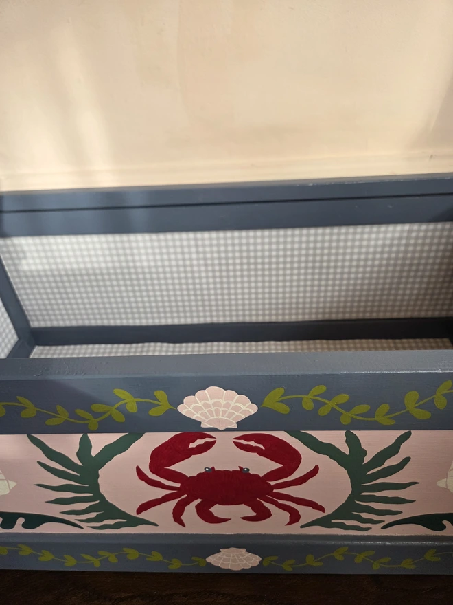 An original, hand-painted wooden chest, sourced from vintage and thoughtfully reimagined. Dottie & Cloud's signature crab, shell and seaweed motifs feature in a sophisticated and pretty palette of soft pink, grey and deep sea greens. The removable lid is...