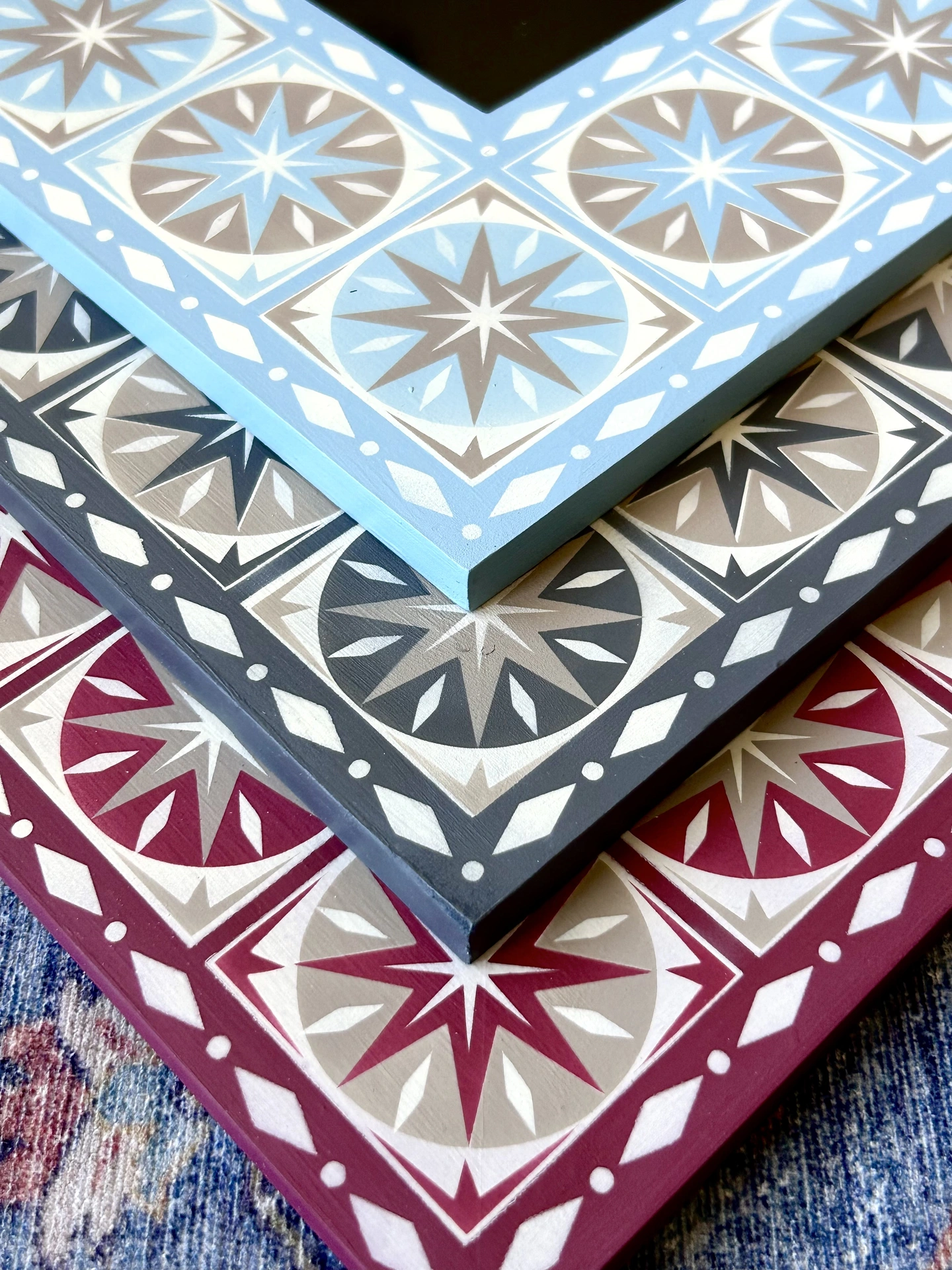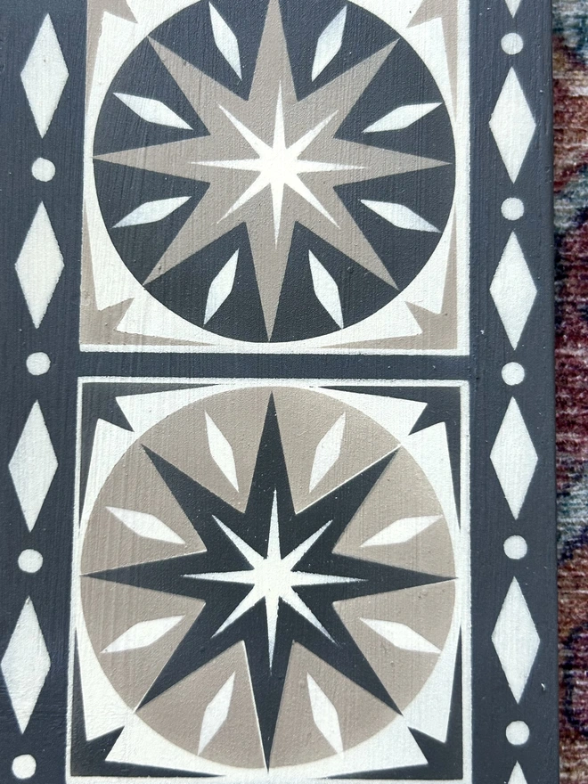 My process begins with hand-sketching my original designs, which I then rendered digitally to create custom stencils. I use an airbrush and high quality chalk paint for a flawlessly smooth finish.