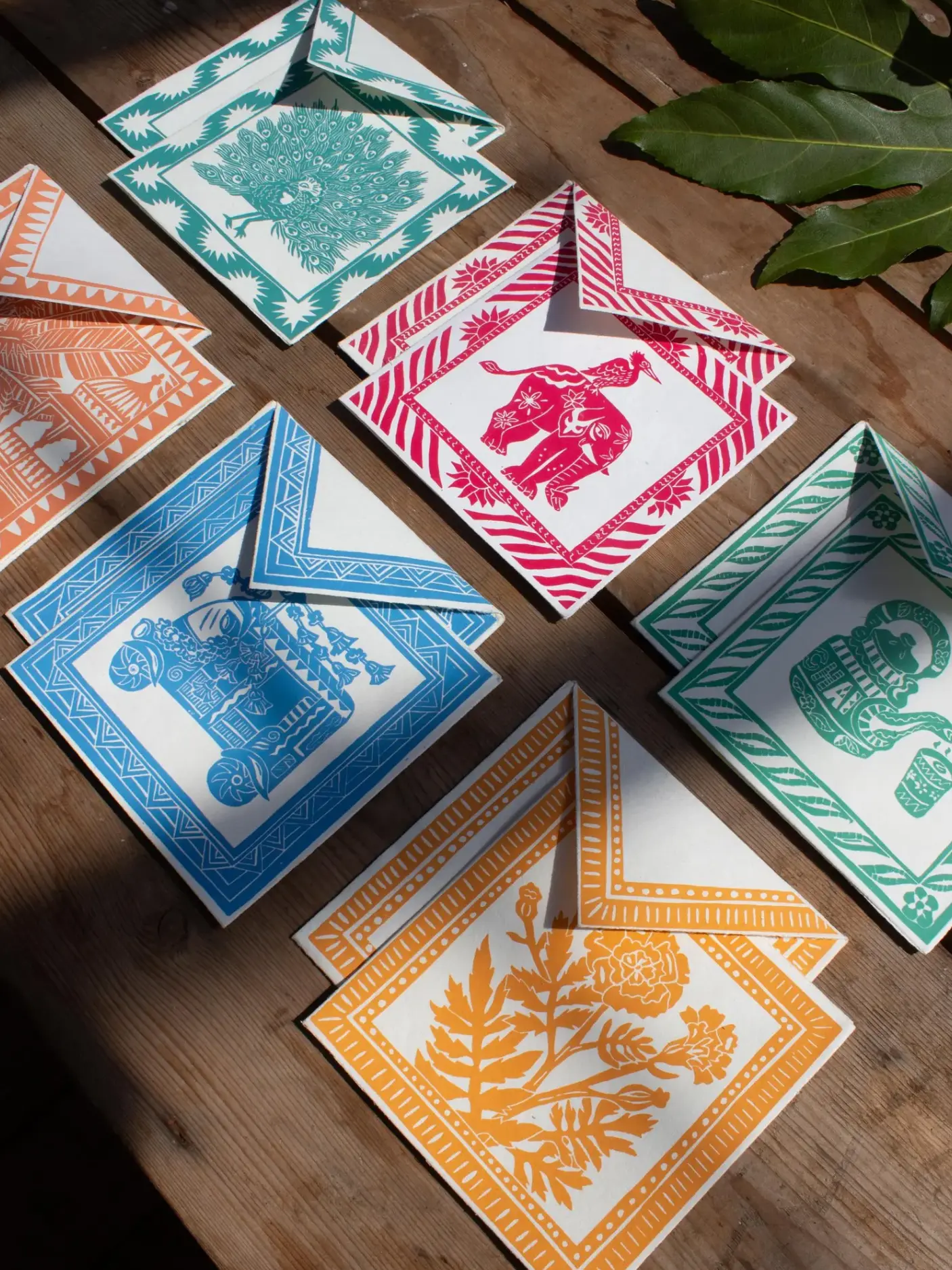 Hand Printed Recycled Cotton Paper Greetings Cards Pack of 6
