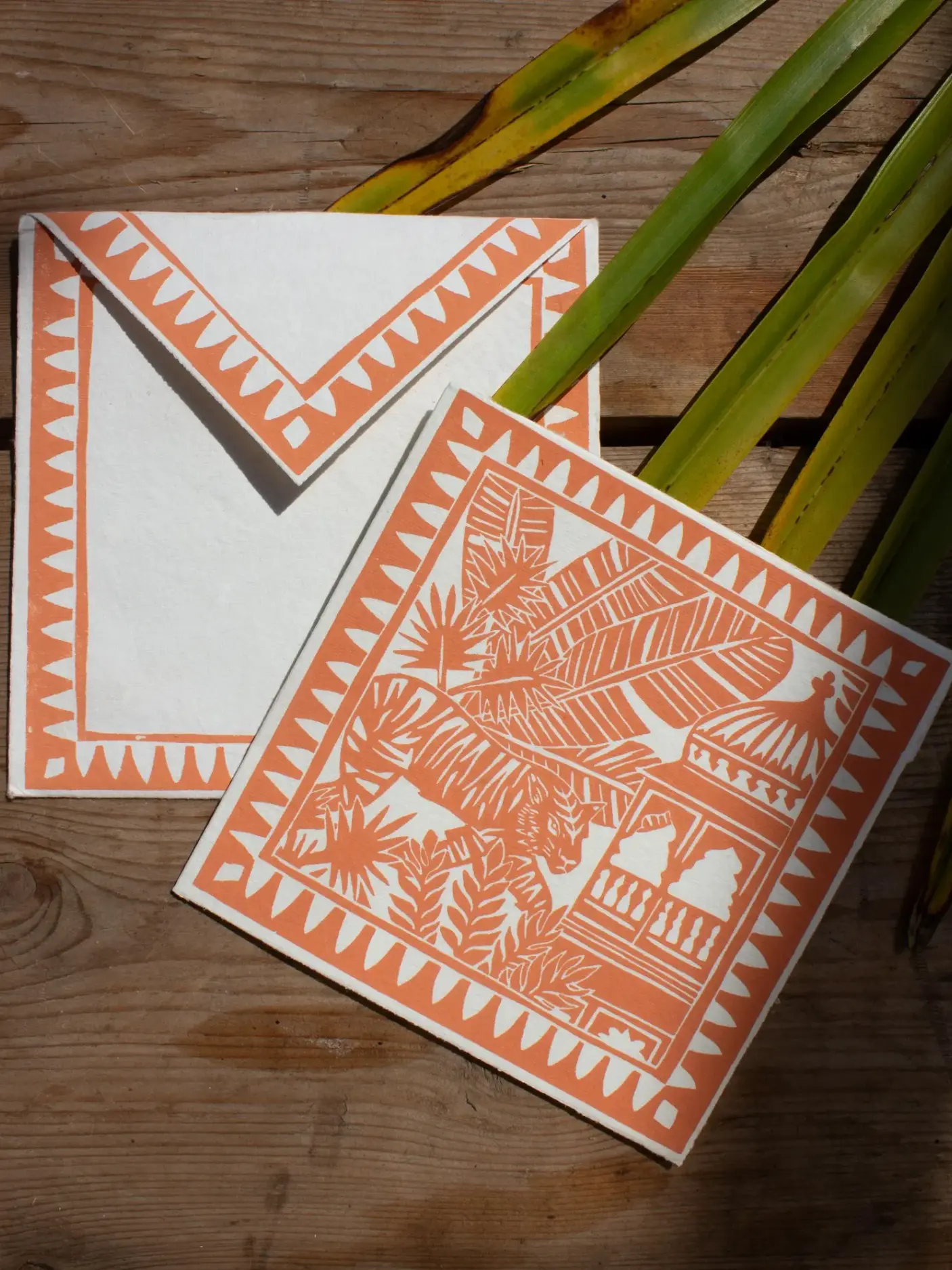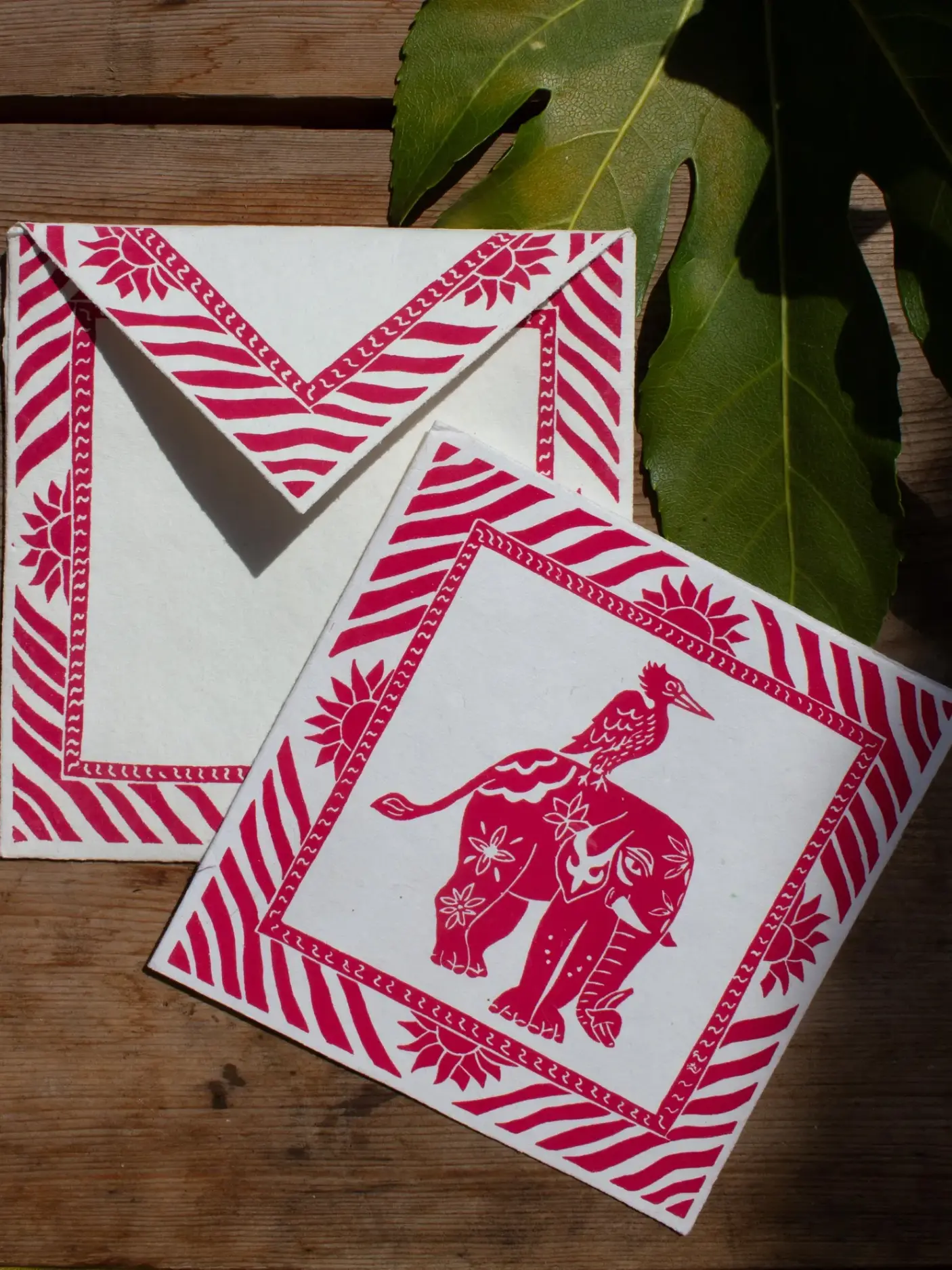Handmade by expert artisans in India using sustainable recycled cotton paper. Our signature greetings cards are hand screen-printed with our original pattern and pair beautifully with our stunning gift wrap.