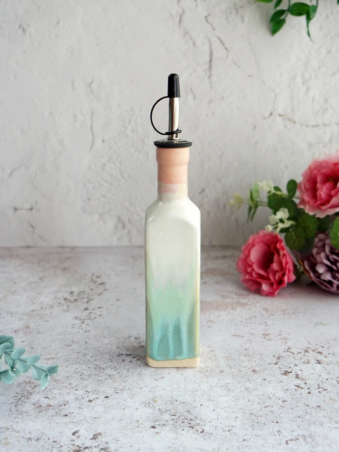 A Ceramic Oil / vinegar Pourer Bottle handcrafted from white stoneware clay and finished in a variety of vibrant colourful glazes.