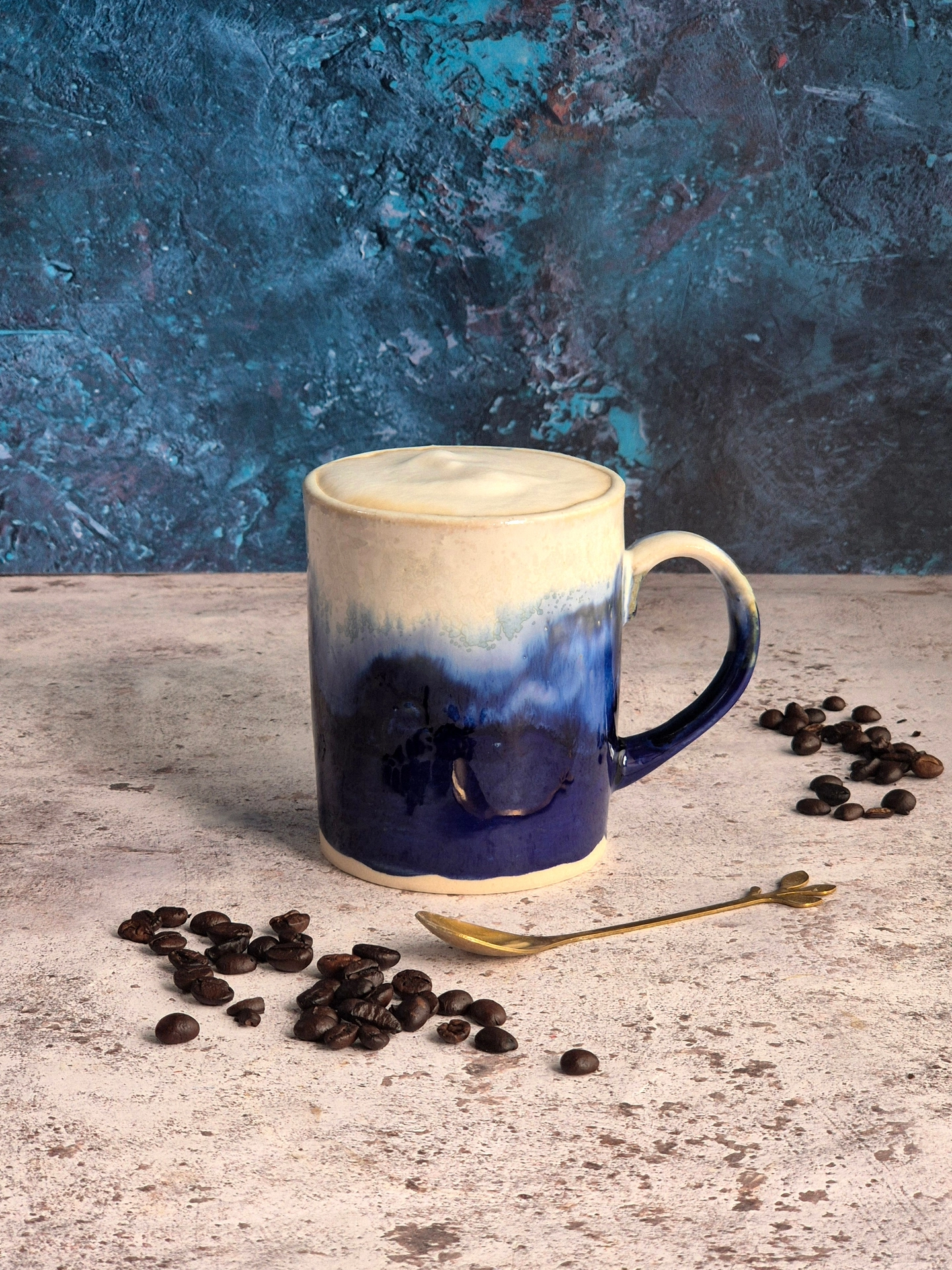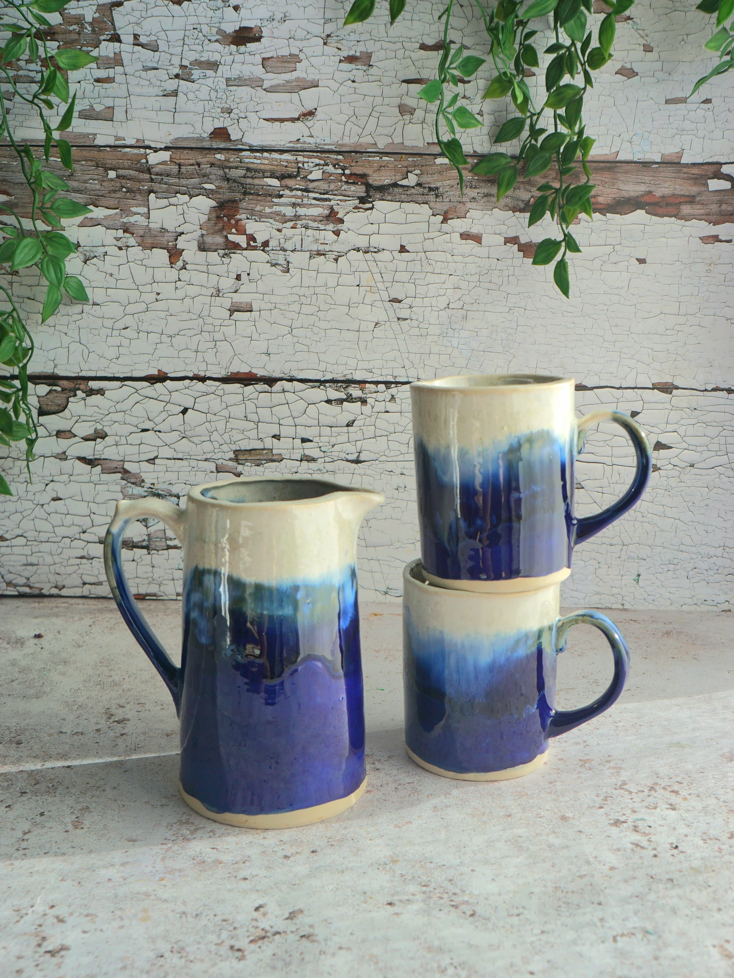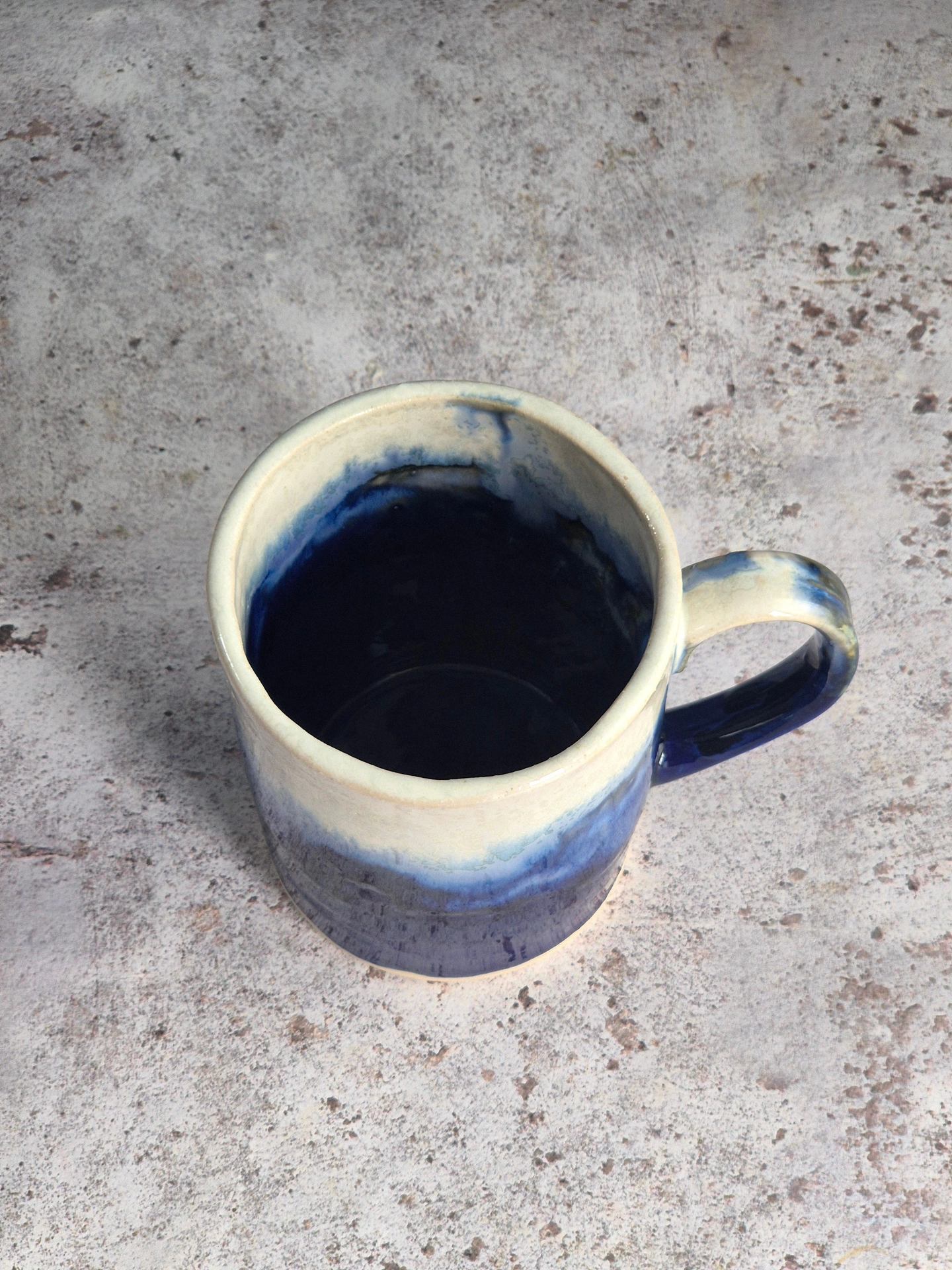 Lulworth Cove - This glaze includes deep cobalt blues melting into hints of lighter blue & greens, and finishing at the top in a mottled white glossy glaze. These mugs encapsulate the ebb and flow of waves through their dynamic glazes.