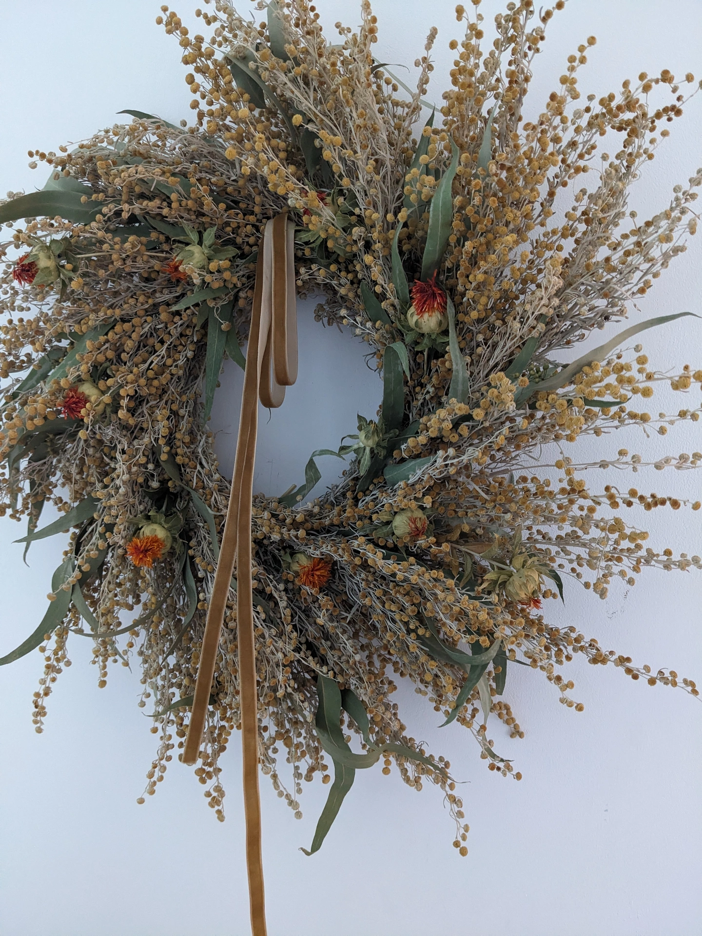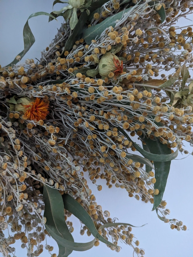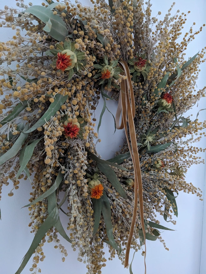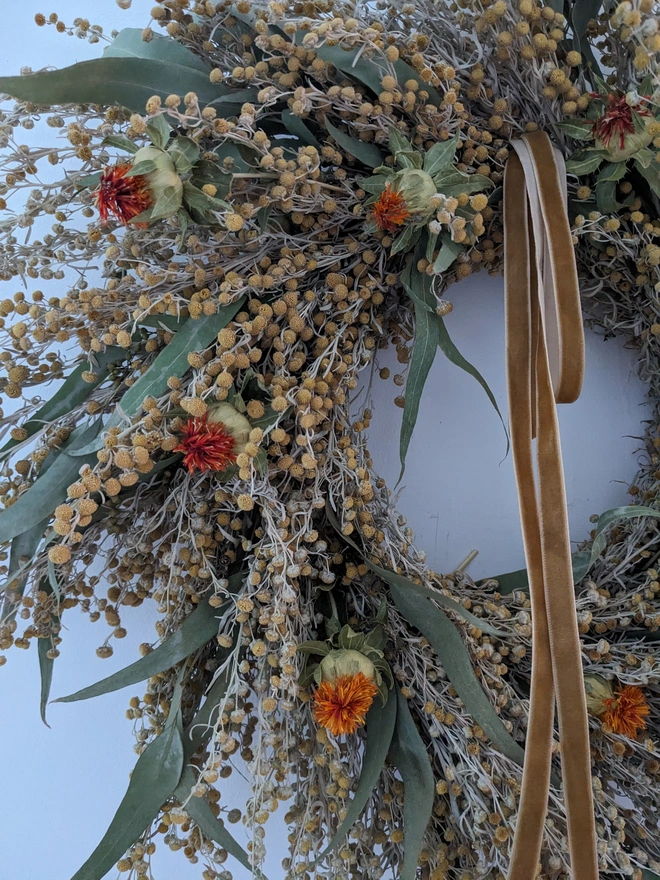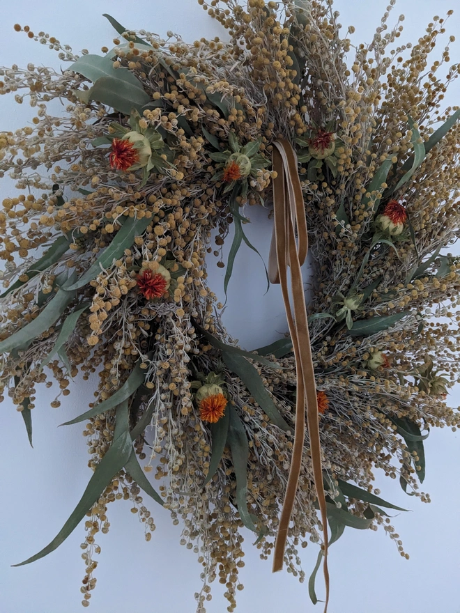 Brighten any space with this handcrafted wreath, beautifully arranged using a selection of dried flowers in yellow and orange tones. Featuring dried artemisia, radiant orange carthamus , warmth, and natural charm.