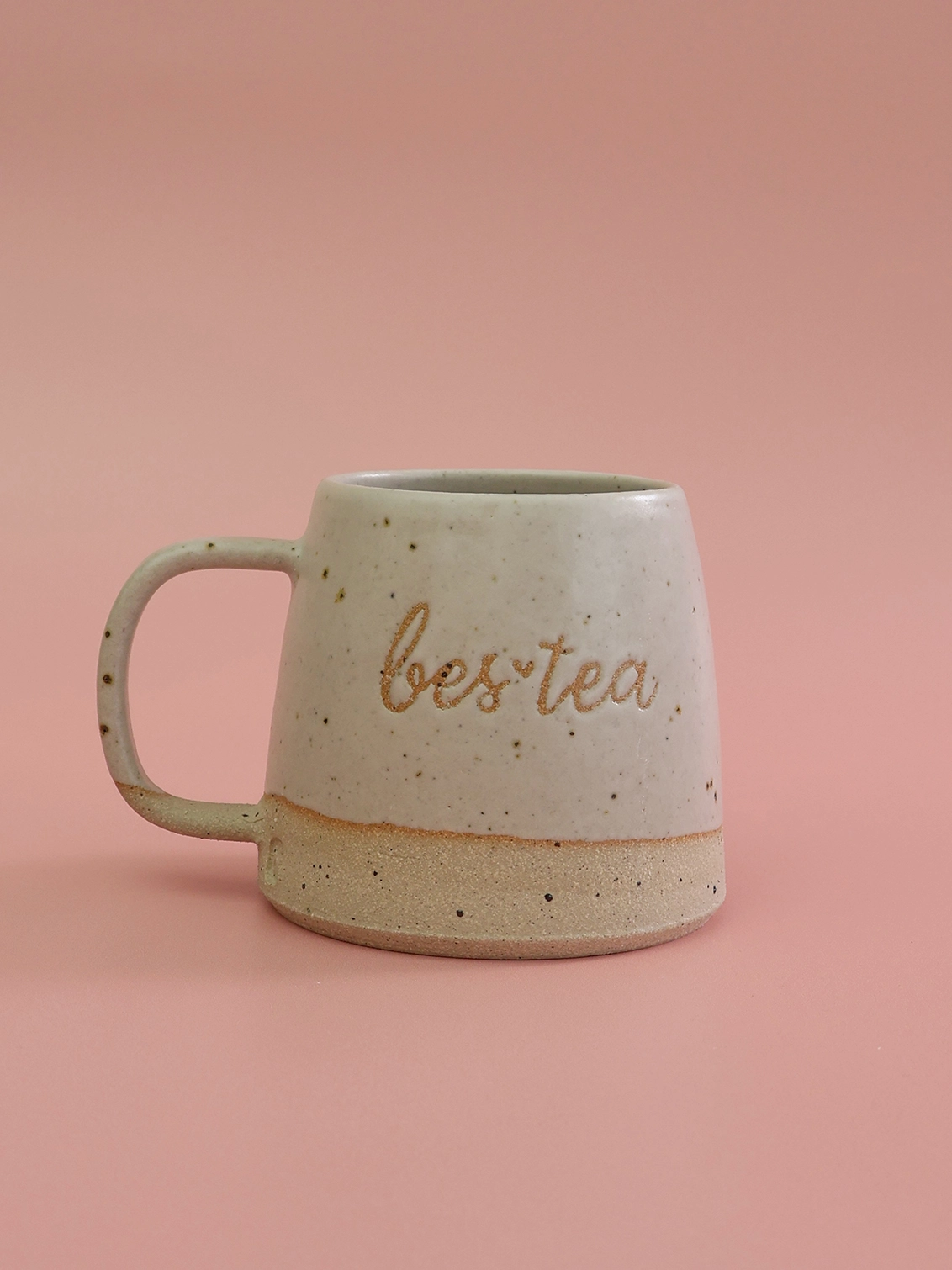 Celebrate your favourite tea loving human with this handmade Bes-Tea mug, a sweet and playful gift for your best friend. Crafted from stoneware clay and finished in your choice of soft white or vibrant fuchsia glaze, each mug is wheel-thrown and one of a kind. The handwritten “Bes-Tea” message is a cheeky nod to friendship – perfect for birthdays, Galentine’s, or just because they deserve a cuppa in style.